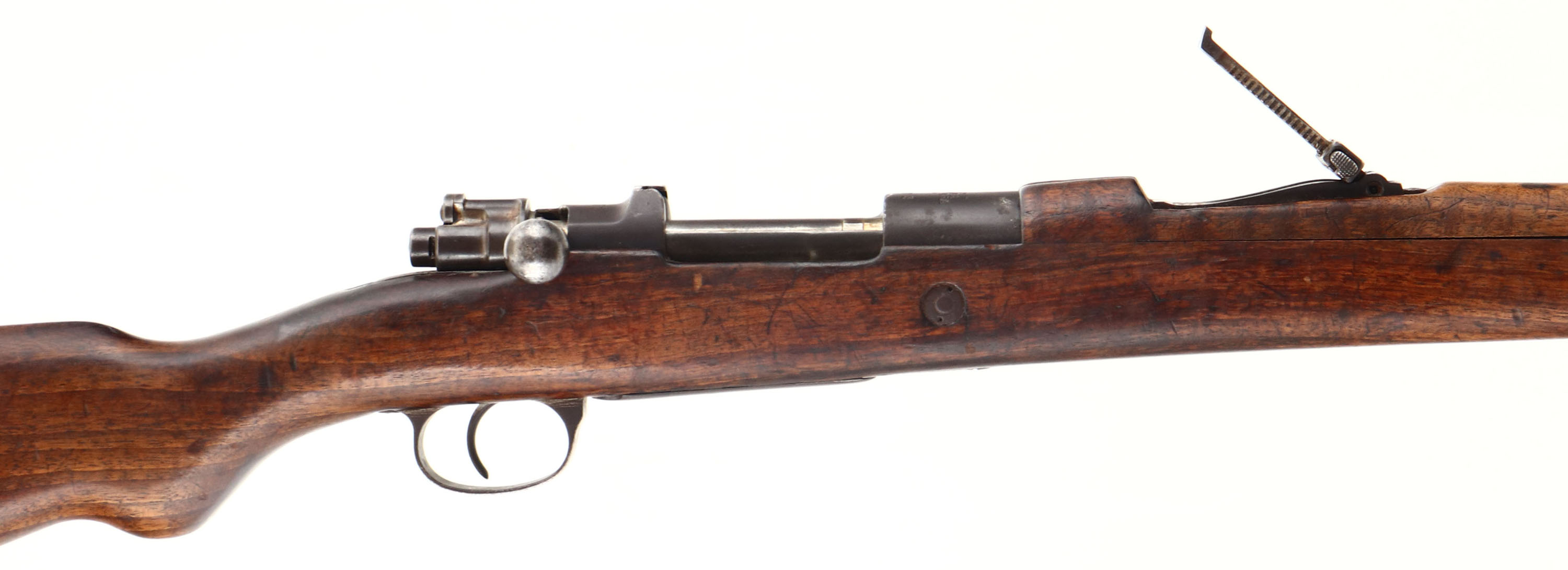 Asfa Ankara. Model: 1893/38. Cal: 7.92x57mm. MFG: 1898. S/N: 35832. Bolt action rifle. 29'' Barrel. The semi pistol grip wooden stock is very good with scratches, gouges, dents, oil darkening & wear from use/age, Bolt disassembly disc in stock. The metal finish rates 30% with pitting at stock line, pitting on metal parts & brown patina. Left side of receiver is marked with importer marks, ''T C'', ''AS FA'', ''ANK ARA'', ''1898'', Crescent Moon/Stars, S/N, end of barrel is marked with importer marks. Bore is very good, slight darkening & light roughness with crisp rifling. Barleycorn front sight, V-notch tangent rear sight marked 1 to 20. Metal buttplate with wear & brown patina. Bottom sling swivels, has cleaning rod. This Rifle started its life as a ottoman 1893 Mauser chambered in 7.65x53mm, some time in the 1930's it was refurbished at a factory to conform to what would be the m38 pattern, rechambered into 8mm Mauser & Gew 98 style bolt was fitted. Antique No FFL Req. - Value: 200 to 400