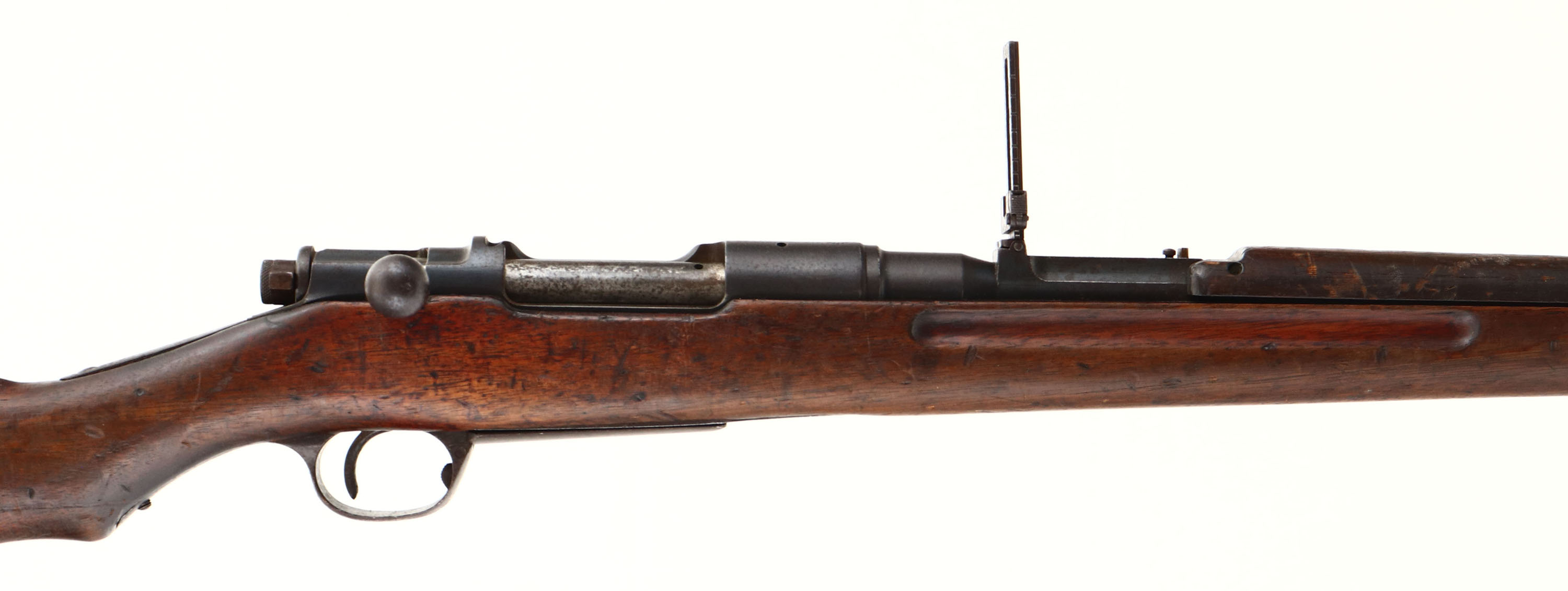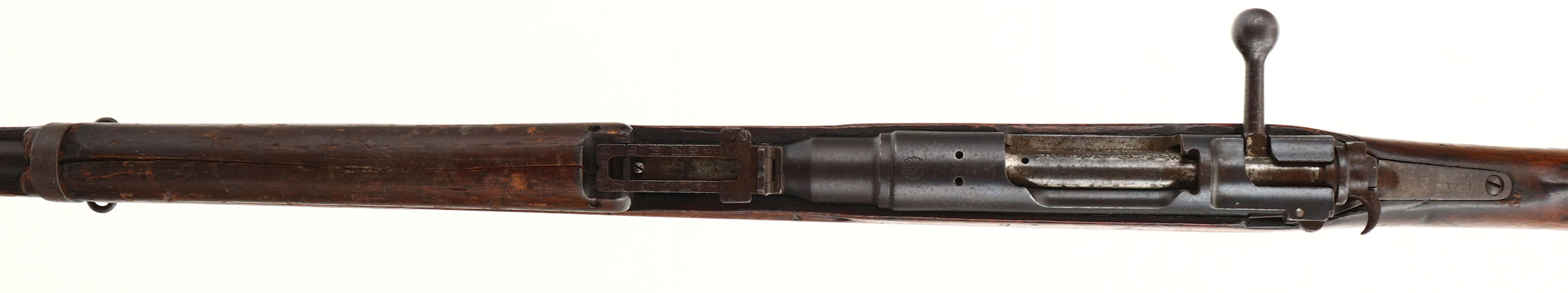 Tokyo Arsenal. Model: Type 30. Cal: 6.5 Jap. MFG: 1897-1906. S/N: 52146. Bolt Action Rifle. 30 1/4'' Barrel. The semi pistol grip wood stock is very good with Factory stock repair at joint of two piece stock on left side, crack down whole top if upper handguard, scratches, chips, dents, gouges & wear from use/age, cartouche on right side of stock ''96''. The metal finish rates 90% overall with light patina speckling. Left side of receiver is marked with S/N, arsenal stamp, top of receiver is marked with chrysanthemum that has stamp over top of it & ''Type 30'' In Japanese, S/N mismatched bolt. Bore is good, dark with roughness but has crisp rifling. Barleycorn front sight, V-notch Ladder rear sight marked 4 to 20. Metal buttplate with brown patina, & plate is slightly proud to the wood at toe. Bottom sling swivels, Cleaning rod. A nice and rare piece being the first ever Arisaka rifle this would make a nice piece to any Military collection. FFL Or C&R Req. - Value: 300 to 900