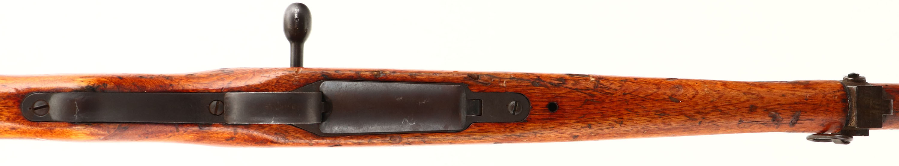 Kokura Arsenal. Model: Type 99. Cal: 7.7 Jap. MFG: 1939-1945. S/N: 22101. Bolt Action Rifle. 25'' Barrel. The semi pistol grip wood stock is very good with scratches, chips, dents, gouges & wear from use/age. The metal finish rates 90% overall with small spots worn to a gun metal gray, inside of magazine box, follower & spring all have surface rust. Left side of receiver is marked with S/N, arsenal stamp, top of receiver is marked with Intact chrysanthemum & ''Type 99'' In Japanese, S/N matched with bolt. Bore is very good, bright & shiny with thinning rifling. Barleycorn front sight with protective ears, Aperture Ladder rear sight marked 3 to 15, Has folding anti-aircraft sight wings & are marked 2 to 3. Metal buttplate with wear & brown patina. Side sling swivels & cleaning rod. This is a really nice example of a early type 99. FFL Or C&R Req. - Value: 250 to 500