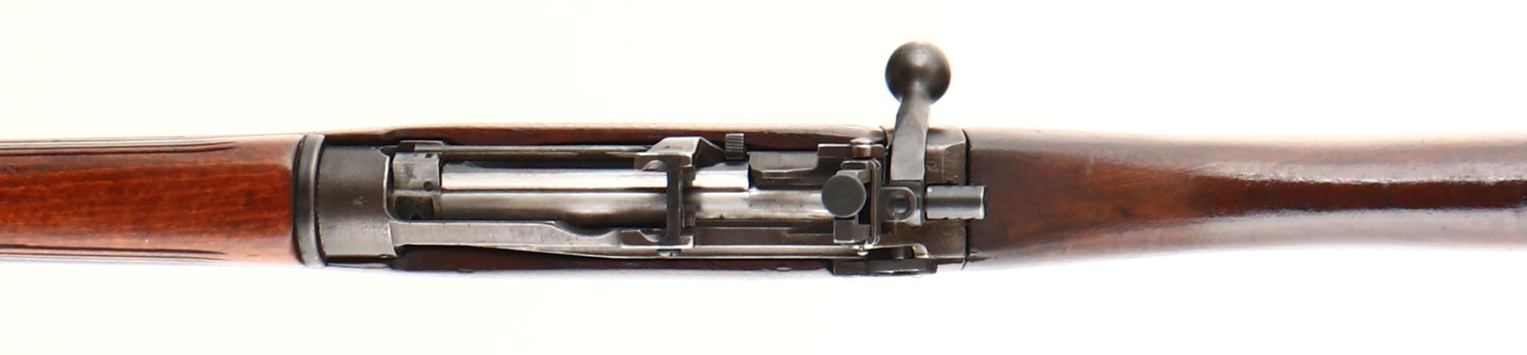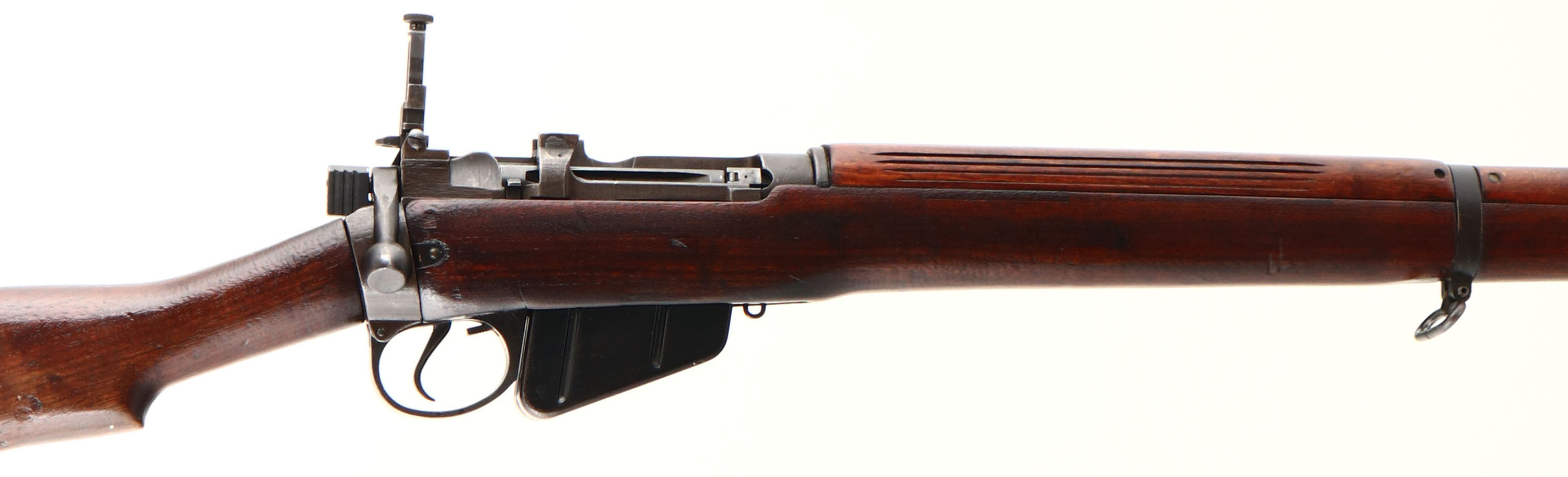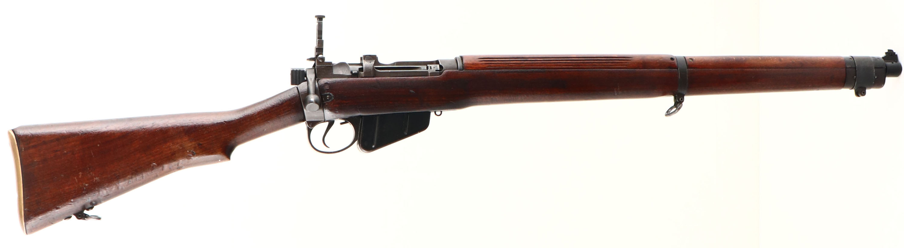 England. Model: No4 Mk1. Cal: .303 British. MFG: 1942. S/N: U6994, Bolt action Rifle, 23 1/2'' Barrel, The semi pistol grip wood stock is very good, it appears to have been lightly sanded & refinished, stock has light scratches & dents, Stock repair on right side of stock by magazine, Argyll & Sutherland Highlanders Cap Badge embedded into left side of stock, The metal finish rates 85 % overall with spots of normal wear, left side of wrist band marked ''2'', ''1942'', S/N, Receiver is marked ''ENGLAND'', S/N Matched Bolt. Bore is excellent. Blade front sight & two position aperture rear sight that is marked 2 to 13. Brass Trapdoor buttplate with no cleaning, front & rear sling swivels, front of barrel has been cut down past the bayonet lugs. FFL Or C&R Req. - Value: 200 to 400