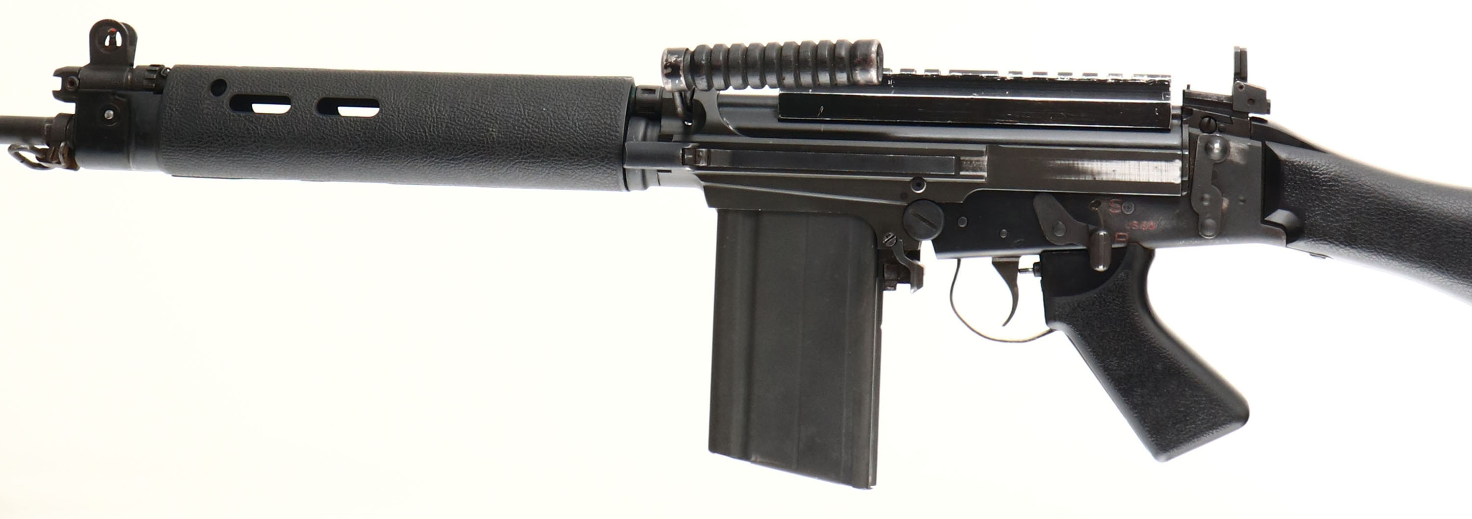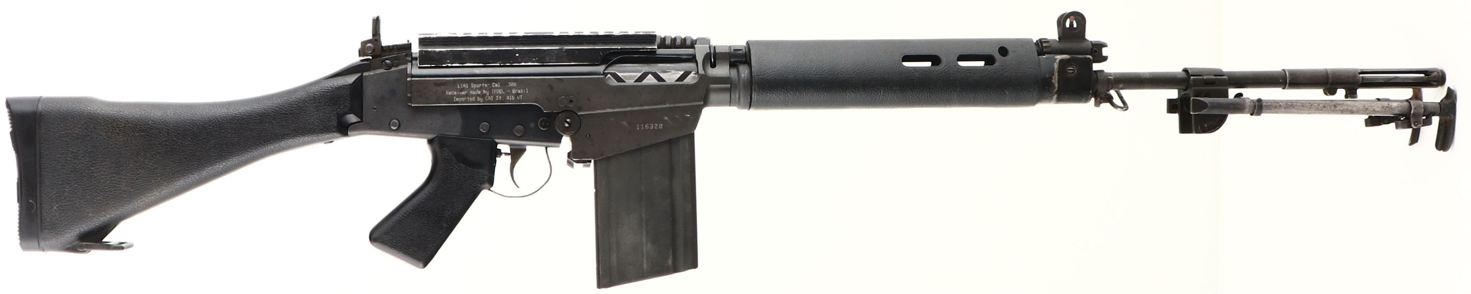 Imbel. Model: FAL L1A1. Cal: .308. MFG: Modern. S/N: 116320. Semi-Auto Rifle. 20'' Barrel. The synthetic stock is very good, with scratches & light wear. The metal finish rates 80% overal,l with spots of wear. Left side of receiver is marked ''UB60 A73882'', right side of receiver is marked ''L1A1 SPORTER CAL. 308'', ''RECEIVER MADE BY IMBEL - BRAZIL'', ''IMPORTED BY CAI ST. ALB VT'', Bore is excellent. Post front sight with protective wings, two position aperture rear sight. Plastic buttpad. Comes with three 20 Rd. mags, bipod, bayonet, with sheath & frog. Comes in a gold velvet lined hard case. FFL Req. - Value: 1200 to 2400
