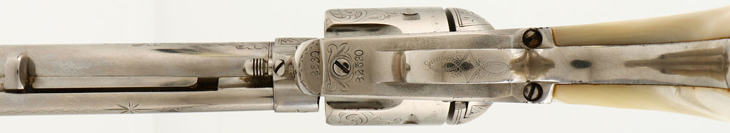 OUTSTANDING Colt, SAA, CAL: 45, MFG: 1882, SN: 82530, Single Action Revolver, 5 1/2'' barrel. This revolver is beautifully factory hand engraved. with scroll, vine & ornamental work on the frame, cylinder, barrel, barrel housing, trigger guard, backstrap & butt. The authentic Mother of Pearl grips are very good, with minor edge chips on the corners & a surface layer edge chip on the bottom of the right grip that has smoothed over time & is not distracting. The nickel finish rates 98% overall, with a couple of areas of light spotting & speckling. Bore is excellent & bright. The barrel holds a blade front sight & the frame has an integrated groove rear notch. This revolver comes with a copy of a Colt Factory letter, confirming the configuration & dates. This is a truly outstanding example of a factory nickeled & factory engraved Colt SAA.* Antique, No FFL Req. - Value: 12000 to 18000