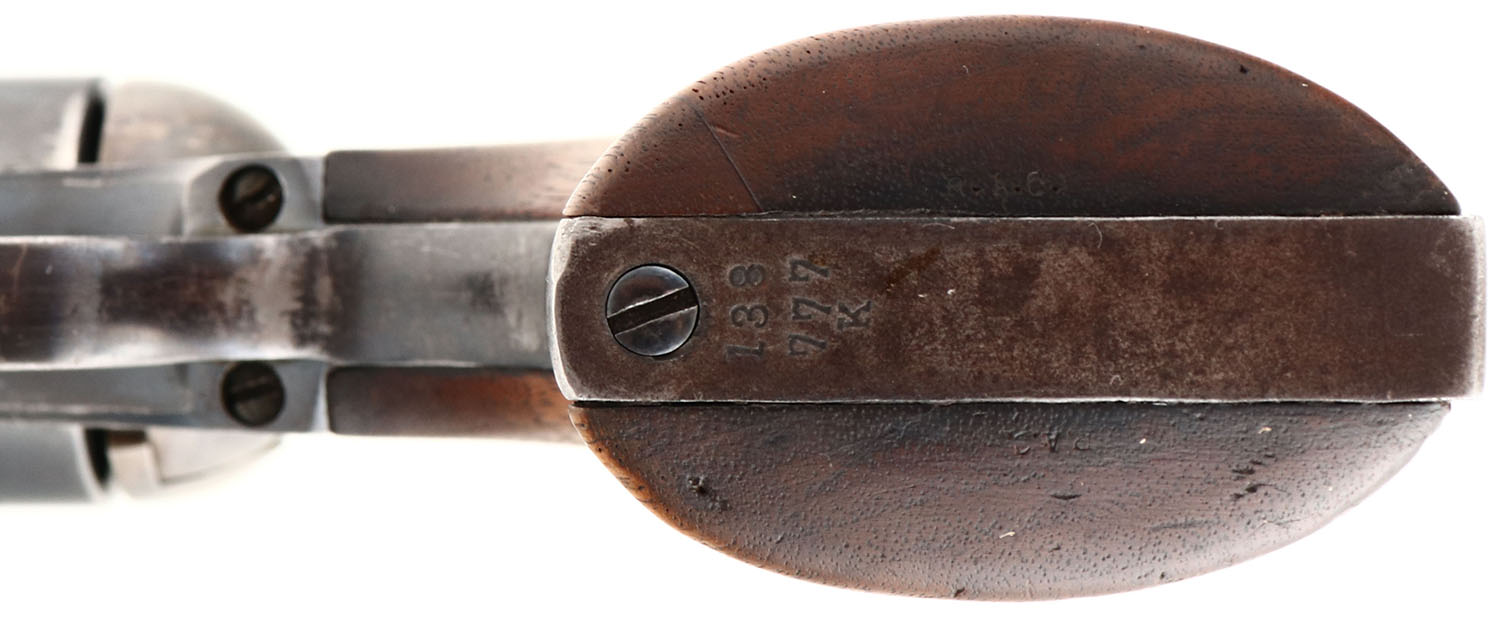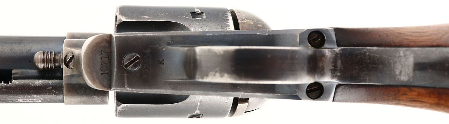 Colt, SAA, U.S Artillery Pistol, CAL: 45, MFG: 1874 (frame SN), SN: 10717, Single Action Revolver, 5 1/2'' barrel. Ainsworth inspected Colts are the first of the U.S. Colt SAA, as seen only through SN 14998 & rarely encountered today. These guns were frequently rebuilt in arsenals & therefore rarely encountered with original matching parts. The top of the barrel is stamped ''COLT'S PT. F.A. MFG. Co HARTFORD, CT. U.S.A.'', the left side of the frame is marked with a three line patent dates ''PAT. SEPT. 19, 1871, JULY. 2, 1872'', followed by the U.S ownership stamp. The frame is stamped '' 10717'', the trigger guard is stamped ''132654'' over ''K'', the butt is stamped ''138777'' over ''K'' & the cylinder has a partial SN '' 7492''. The bottom of both grips are stamped ''R.A.C''. The right grip has a ''R.A.C'' cartouche inside rectangle. The wood grips are excellent, with a small corner chip repair on the bottom of the left grip, along with other very minor contusions & scrapes. The metal blue finish on the barrel, cylinder rates 85%, with a drag line & wear at the muzzle & cylinder ends. The backstrap & trigger guard are a mix of remaining blue & areas worn to metal gray, with a thin brown patina. The case-hardened frame retains outlines & faded case-colors. Bore is excellent, with minor spotting & speckling. The barrel carries a blade front sight & the frame has an integrated rear groove. Action is tight & appears to function properly. The Colt Single Action Army is a worldwide icon of the U.S. & the Western Frontier. Wielded by both the long arm of the law, military & bad men, the famous Single Action Army became well-known as the Peacemaker. Excellent example.* Antique, No FFL Req. - Value: 7000 to 10000