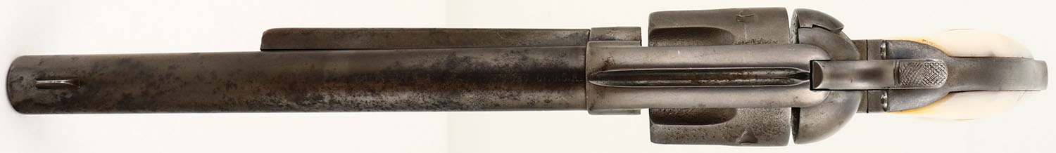 Colt, SAA, CAL: 44-40, MFG: 1882, SN: 75908, Single Action Revolver, 7 1/2'' barrel. The Mother of Pearl grips are very good, displaying looks of fire & color, but with a couple small nicks on the left grip & a larger corner chip on bottom rear of the right grip. The top of the barrel is marked in a single line address ''COLT'S PT.F.A.MFG Co HARTFORD CT. U.S.A'', the left side of the barrel has a rare etched panel that's barely legible, but says ''COLT FRONTIER SIX SHOOTER''. The left side of the frame is stamped with a three line patent dates ''PAT SEPT 19 1871, JULY 2,-72, JAN 19,-75''. The cylinder has a partial SN ''5908'' & the full SN is stamped on the frame, trigger guard & butt. The metal has fully worn to gun metal gray, with spotting & cleaned pitting. Bore is very good, with intermittent spotting near the muzzle, amongst proud rifling. The barrel holds a half-moon blade front sight. A nice pearl gripped early etched panel Colt SAA.* Antique, No FFL Req. - Value: 3000 to 6000