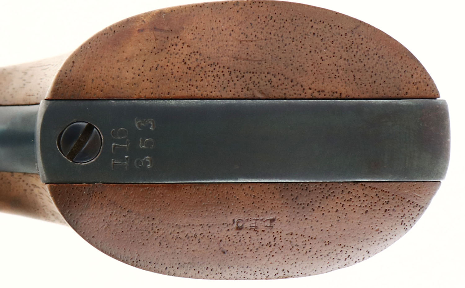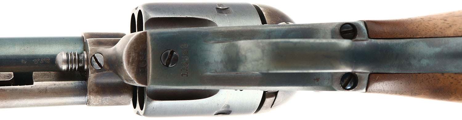 Colt, SAA, 1st Gen, CAL: 45 LC, MFG: 1885, SN: 116353, Single Action Revolver, 7 1/2'' barrel. This revolver has a partial professional restoration. The top of the barrel is marked, ''+COLT'S PT. F. A. MFG. Co. HARTFORD CT U.S.A+'', the left side of the frame is marked with a three line patent date, ''PAT SEPT 19, 1871 PAT JULY 2, 72, JAN 19 75'', followed by a ''U.S'' marking. The full SN is marked on the frame, trigger guard, butt & a partial SN is stamped on the cylinder. You can find ''DFC'' inspector marks on the barrel bottom, frame, cylinder & the bottom of the right grip. The wood grips are very nice replacements & carry reproduction stampings, grips are in excellent condition. The left side displays a ''1885'' cartouche, over slightly worn initials, inside a circle. The right grip has a ''DFC'' cartouche in a rectangle. The metal blue finish on the barrel, trigger guard & backstrap has been refinished with a more modern blue rating 95%, with some polishing lines & previous contusions or wear under the current blue. The cylinder shows polish lines & has a lighter silver blue. The case-hardened frame displays faint tones & shadowing of case-colors, with an aged patina. The ejection rod housing is case-colored rather than blued. Bore is excellent. The barrel holds a replaced front blade sight, which has been slightly reshaped & has file marks along the upper edge. Comes with a fantastic hand tooled Jack of Diamonds ''Slim Jim'' holster in excellent condition. This is a nice looking example of a restored SAA. Antique, FFL Req. - Value: 1500 to 3000
