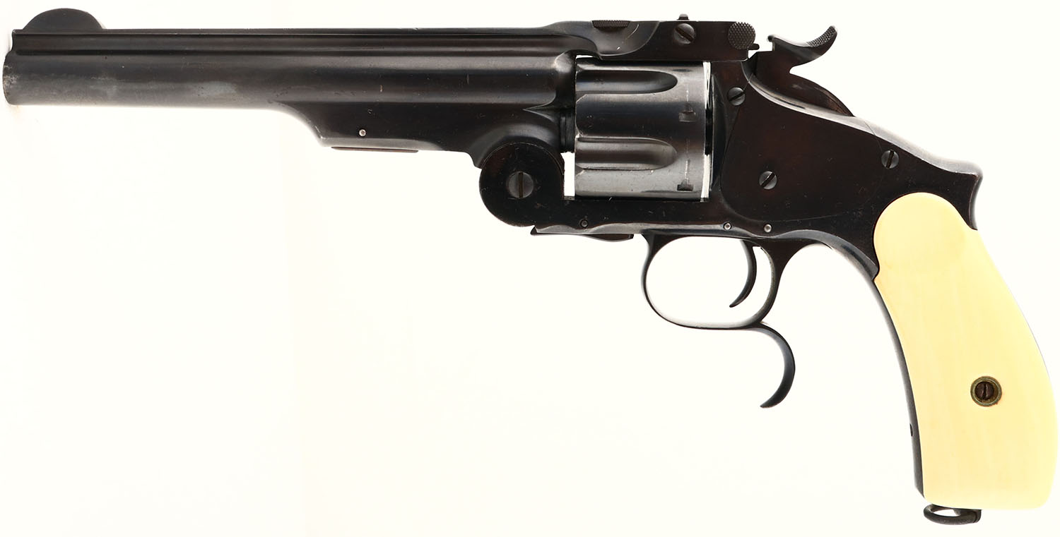 Smith & Wesson, 1874 3rd Model, Old model Russian, Cal. 44 Russian; MFG: 1874-78, SN: 4623, Single Action Revolver, 6 1/2'' barrel, air bore, good grips, 6.25'' barrel, Faux Ivory grips are excellent, with very nice coloring to match aged ivory. The metal finsh is an older aged professional reblue, retained at 95% & showing some scratches & pitting under the current blue. Bore is excellent, with some haze & speckling at the muzzle amongst strong rifling. The buttstrap stamped with 1874 above SN. The characteristics of the 3rd model are the trigger spur, large screw on top strap & a front sight forged into the barrel. Though refinished, this 3rd model Russian revolver is quite collectible & presents well. Antique, No FFL Req. - Value: 1000 to 2000