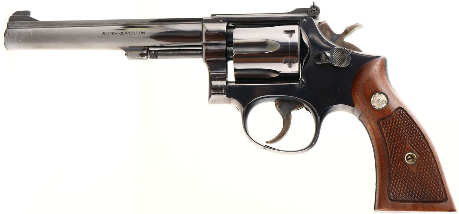 BOXED, Smith & Wesson, Model 48 (1st Variations), CAL: .22 MRF (WMR), Double Action Revolver, MFG: 1959, SN: K404825, 6'' barrel, The original checkered grips are excellent. The original high gloss metal finish is 98%. Case-hardened hammer & trigger, strong colors. Adjustable rear & ramp front sights. Bore is excellent. Comes in original SN matching box, with original paperwoork & wax paper. FFL or C&R Req. - Value: 600 to 1200
