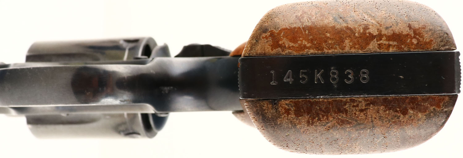 Smith & Wesson, Model 19-5, CAL: 357 MAG, MFG: 1985, SN: 145K838, Double Action Revolver, 2 1/2'' barrel. The factory brass medallions & checkered wood grips are very good, but with finish wear from use & handling. The original blue finish is 92%, with most loss due to muzzle wear. Case-colored hammer & trigger. Bore is excellent. Adjustable square notch rear sight & ramp blade front sight. Overall, a very nice condition. FFL Req. - Value: 400 to 800