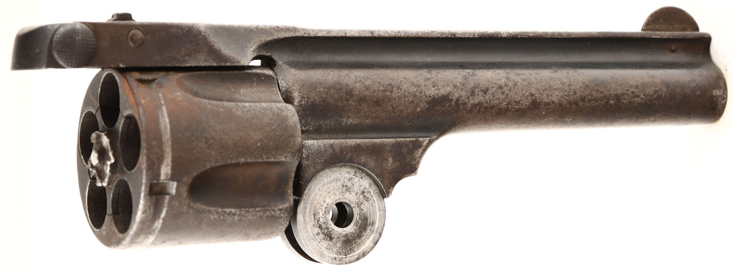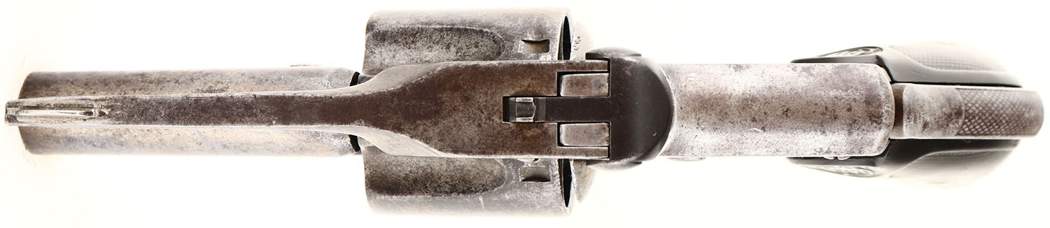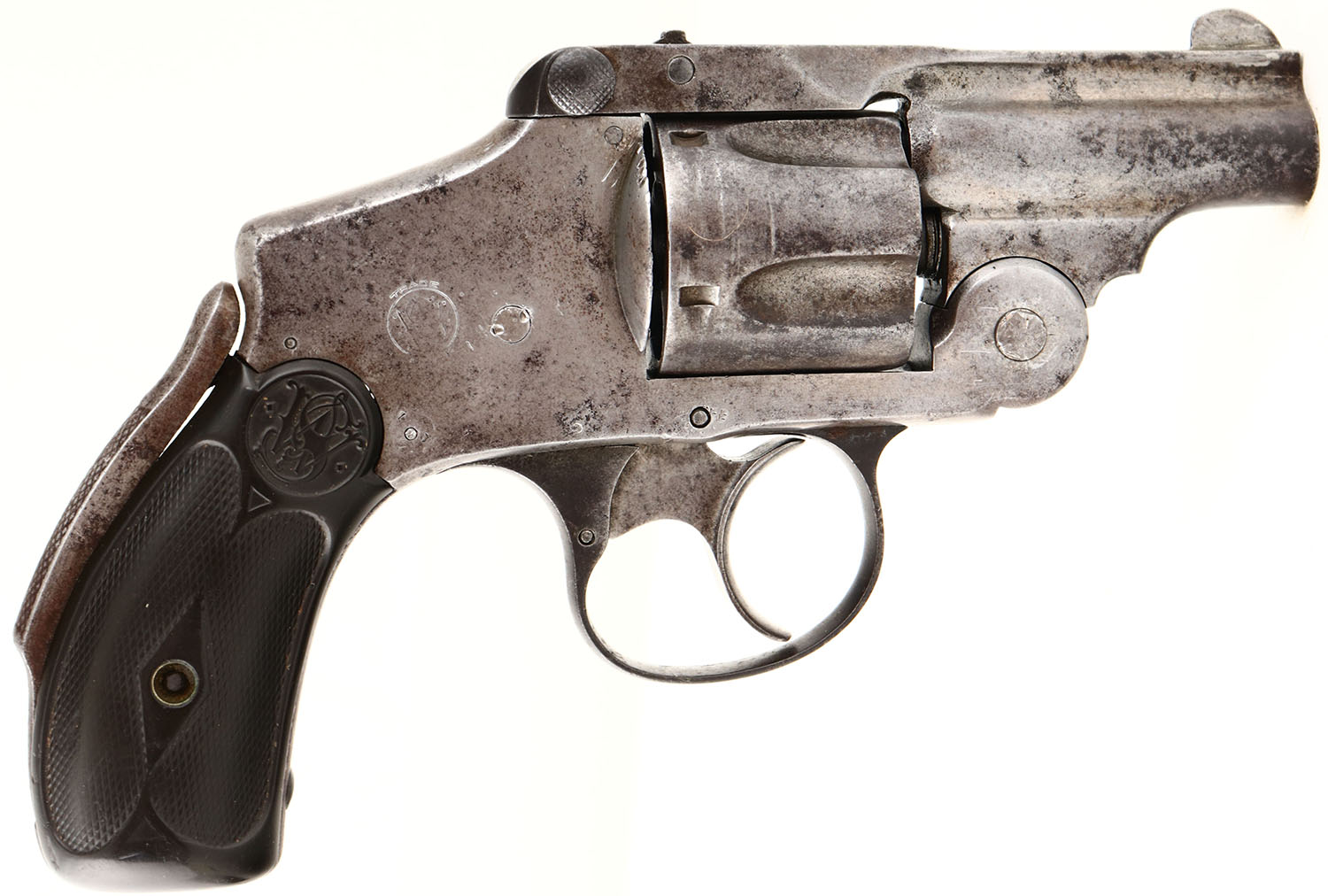 Smith & Wesson, Model Safety Hammerless 4th model (Lemon Squeezer), .38 S&W Cal., Double Action Revolver, Mfg. 1898-1907, SN: 187534, Rare Special Order 2'' barrel, Comes with an additional 4'' barrel & cylinder. Original checkered hard rubber grips are very good, but with worn checkering, mostly smooth on right side. Metal finish is worn gun metal gray, with some brown patina & spotty areas of cleaned rust pitting. Bores are good. Integrated rear & blade front sight. FFL & C&R Req. - Value: 200 to 400