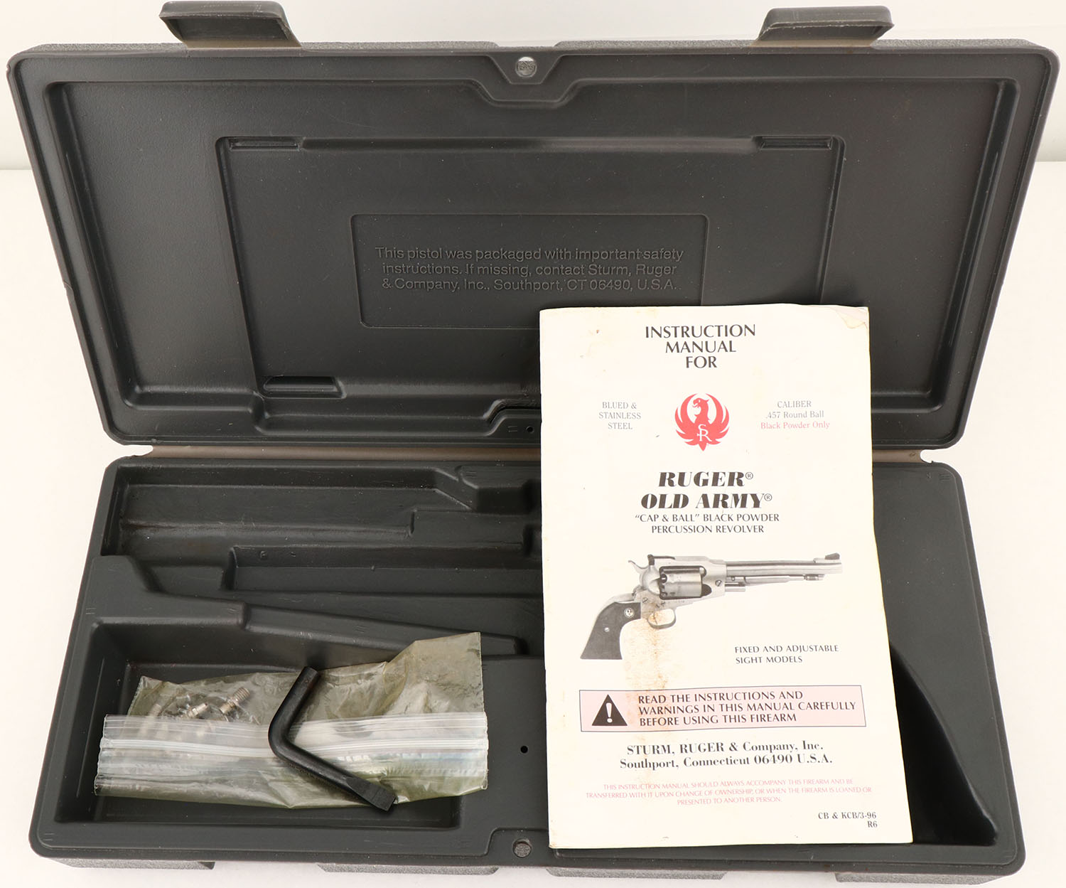 CASED, Ruger, Old Army, CAL: 44 (.457 Ball Diameter), MFG: 1996, SN: 145-85017, Single Action Black Powder Revolver, 7 1/2'' barrel. The Ruger logo medallion wood grips are excellent. The polished blue finish is excellent, with some light rust to base of trigger, Bore is excellent, with sharp rifling. The frame has an adjustable rear sight & the barrel holds an elevated blade front sight. Comes in original case, with owners manual, extra nipples & Tool, Black Powder, No FFL Req. - Value: 500 to 1000