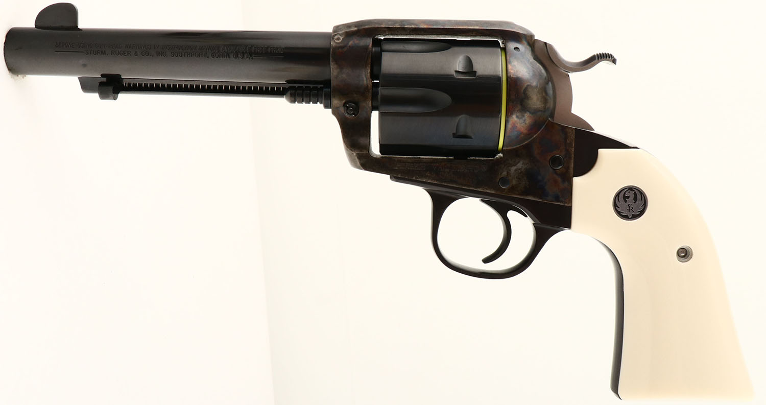 CASED Ruger Model ''Vaquero'', CAL: 45, MFG: 2003, SN: 58-18728, Single Action Revolver, 5 1/2'' barrel. The faux ivory grips with medallion Ruger logo are mint. The polished blue finish rates 100% overall, with vivid case colors on receiver. Bore is excellent, near mint. Factory sights. Comes with original box with paperwork, lock & spent shell fired at factory, NIB. FFL Req. - Value: 500 to 1000