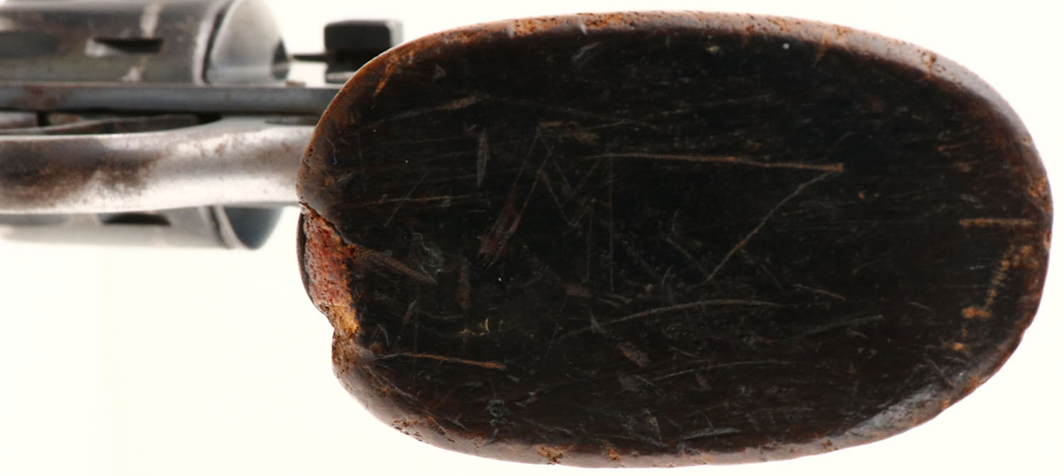 Harrington & Richardson, Model SPORTSMAN (999), 1st model & 1st variation Cal. 22 LR, Double Action Revolver, Mfg. 1932-39, SN: 54026, 6'' barrel, 9 shot, The checkered one piece wood grips good & solid, but with worn black finish & a small chip at the bottom of the front strap. The original metal finish rates 80%, with thinning wearat carry points. Case-colored hammer. Bore is excellent. Appears to function well. Nice early example. FFL or C&R Req. - Value: 200 to 400