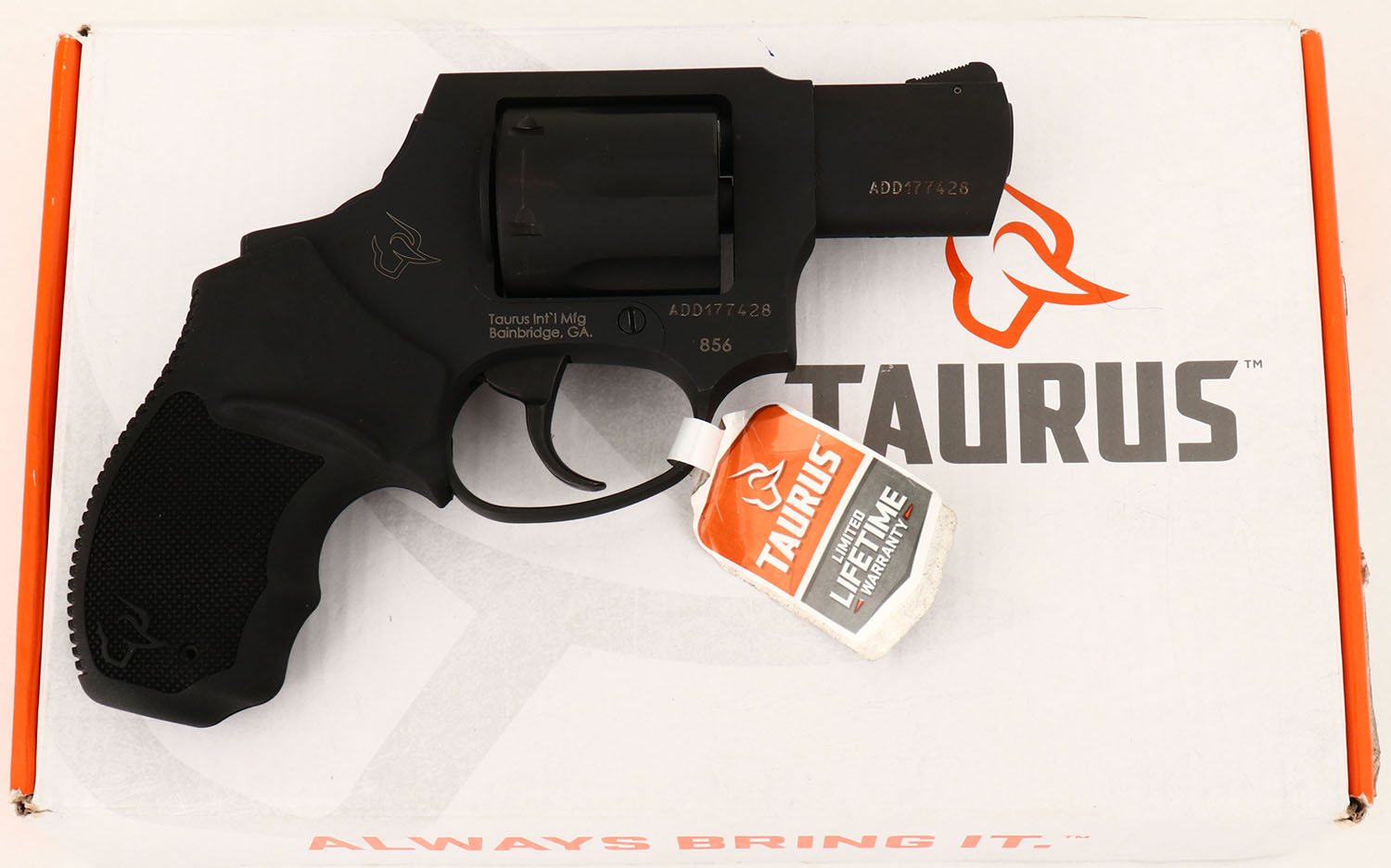 BOXED Taurus, Model 856, CAL: 38 SPL, MFG: modern, SN: ADD177428, Double Action Revolver, 2'' barrel. The original checkered rubber grips are excellent. The original matte blue finish is near mint. Bore is mint. Spurless or canceled hammer model for easier personal carry. Factory sights. NOS with paperwork. A NIB & quality revolver. FFL Req. - Value: 250 to 450