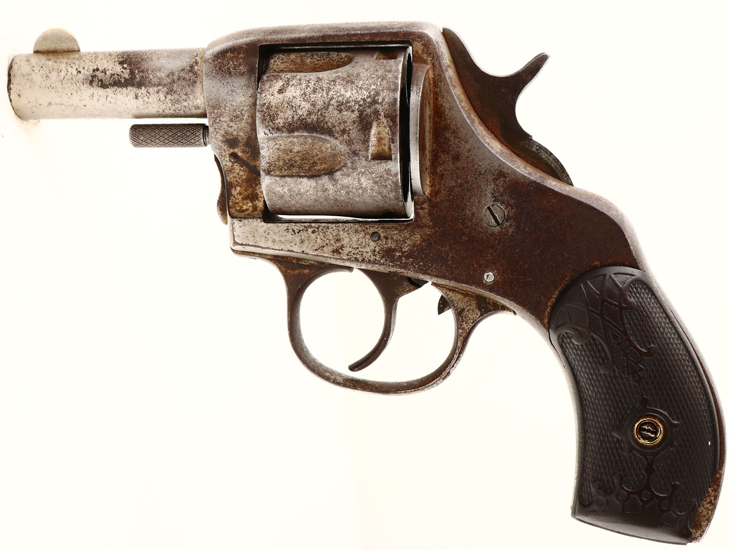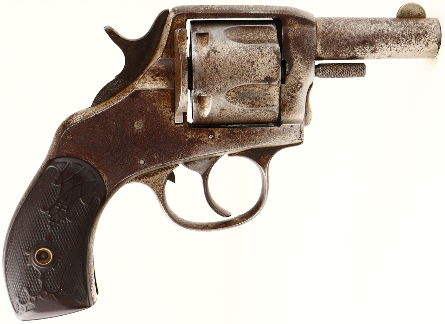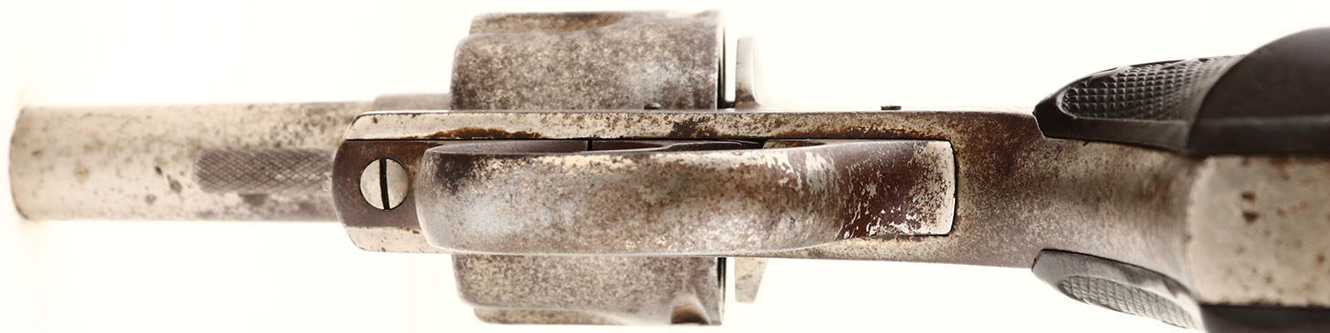 Harrington & Richardson, Model The American Double Action, First Model 2nd Variation, Cal. 44 Webley, Double Action Revolver, Mfg. 1880's-90's, SN: 12, 2 1/2'' barrel, 5 shot, The original checkered hard rubber grips are good, with wear & a missing chip at the bottom back corner of left grip. The metal nickel finish has mostly worn away, with worn areas toned to a brown patina. Bore is fair. Cylinder, trigger & hammer need some adjustment or repair to fully function properly. Antique, No FFL Req. - Value: 50 to 250
