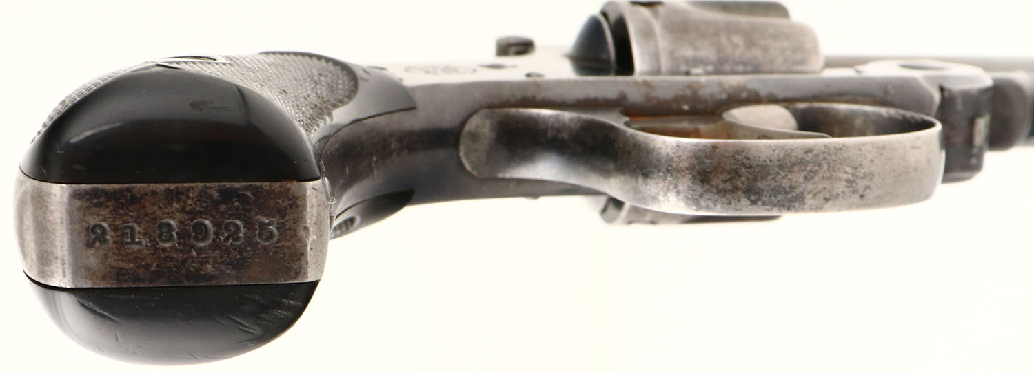 S&W, Break top, .32 cal., S/N: 218925. MFG. 1909-37. 3'' barrel, double action revolver, The S&W monogramed & checkered hard rubber grips are very good, with some edge wear & rubs. The original polished blue finish is retained at 65%, except cylinder is worn to a silver tone. Trigger & hammer have some case-colors, The bore is very good, with some roughness. The action is tight & functions correctly. FFL or C&R Req - Value: 200 to 400