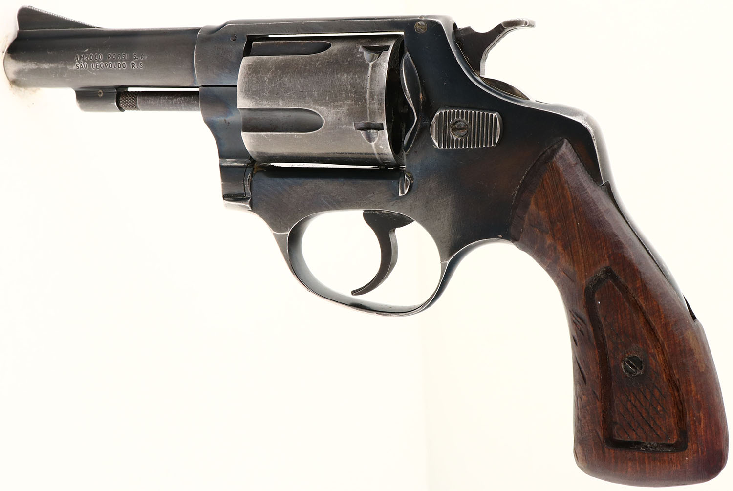 Rossi - Interarms, Model 68, CAL: 38 SPL, MFG: 1978-85, SN: D523911, Double Action Revolver, 3'' barrel. The non-professionally hand carved wood grips are good & solid, but have the carving marks & a couple of small hairline cracks. The metal blue finish rates 70% overall, with most of the loss on the cylinder. Bore is very good & bright. Factory sights. Appears to function properly. FFL Req - Value: 100 to 300