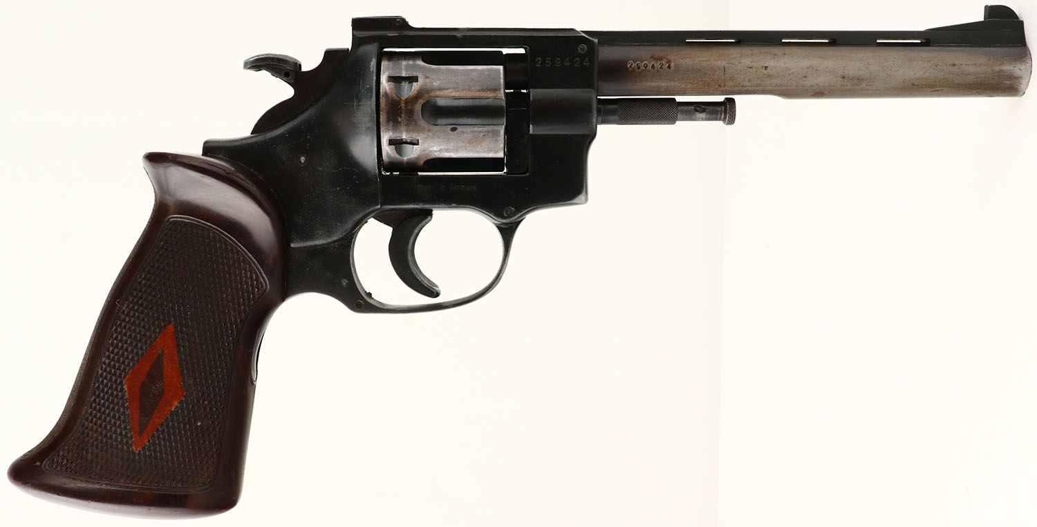 Arminius, Model HW9, Cal. .22 LR, Mfg. 1970's, SN: 259424, Double action revolver pistol, 6'' Ribbed barrels, The checkered wood grips are excellent with minor wear, Metal blue finish has worn mostly gun metal gray on the barrel & 80% on frame, Bore is excellent. Has grooved vent rib barrel, target wood grips & target trigger. Missing rear sight. FFL Req. - Value: 150 to 300