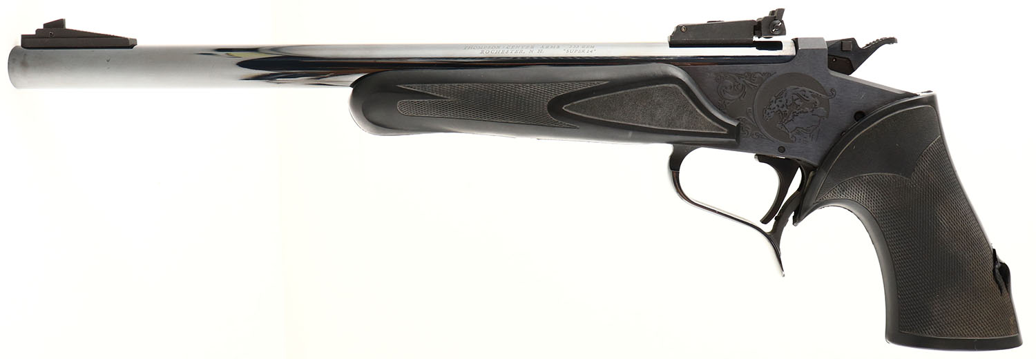 Thompson Center Arms, Model: Super 14 Contender, 2 barrel set .223 REM 14'' & 45 Colt 10'', Single shot, single action break barrel. Mfg. 1983. SN: 229486, 14 & 10'' barrels. The original checkered Pachmayr rubber grips are excellent, with some light wear. The original metal finish is 97% overall. Features an etched cougar perched on ledge on both sides of receiver. Has original sights. Bores are excellent. Easily interchangable barrels. Great target pistol. FFL Req. - Value: 600 to 1200
