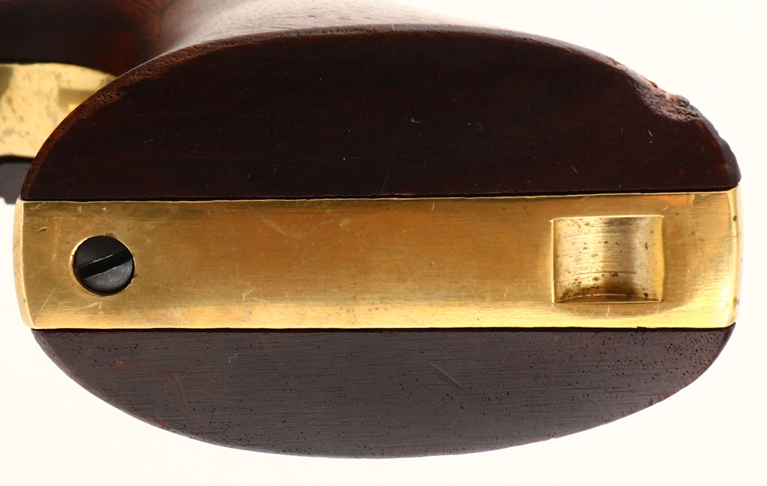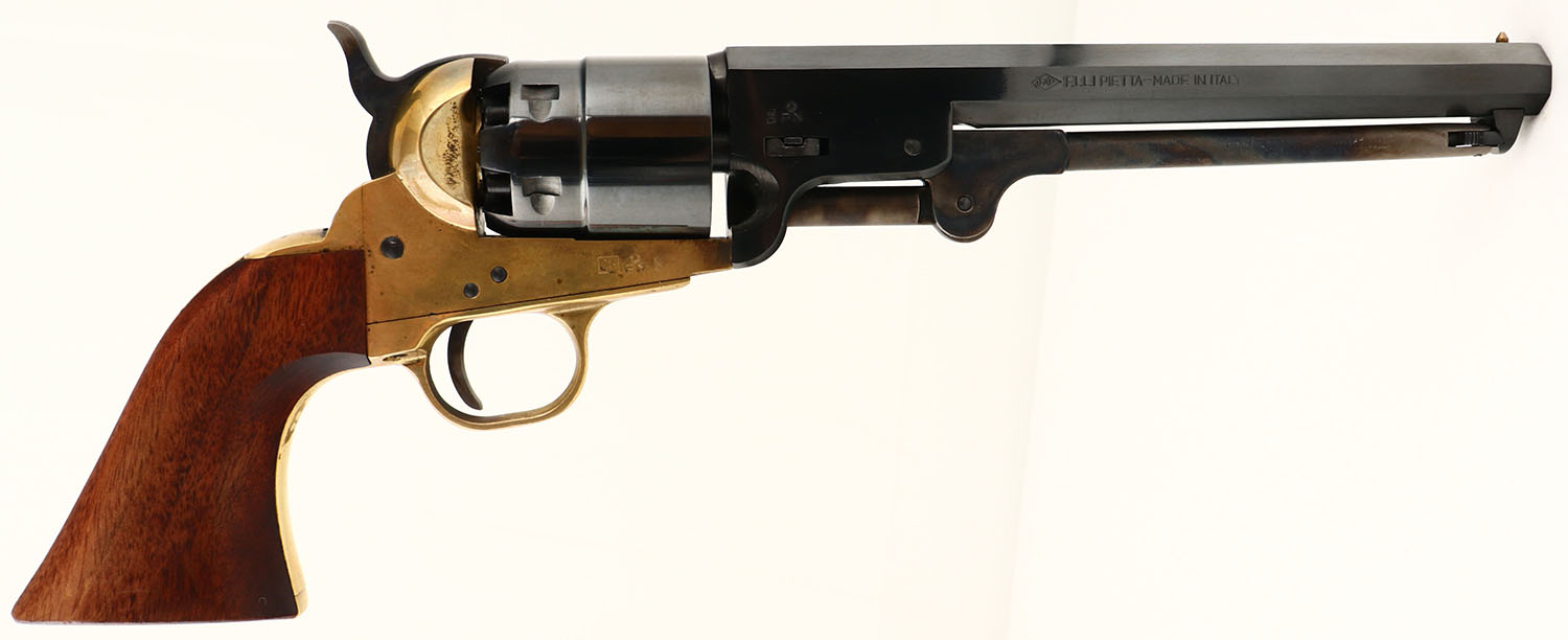 F. LLI Pietta, Model 1851 Navy, CAL: 44, MFG: Modern, SN: 592362, Black Powder Percussion Revolver, 7 3/8'' barrel. The original wood grips are excellent. The factory blued barrel & cylinder are excellent, brass frame is excellent, the case-hardened hammer, trigger & loading lever have vivid case-colors. All finishes rate 99%+. Bore is excellent. The barrel carries a single gold post bead. A high condition, modern black powder revolver. Matching revolver in also in previous & next lots. Black Powder, No FFL Req - Value: 250 to 500