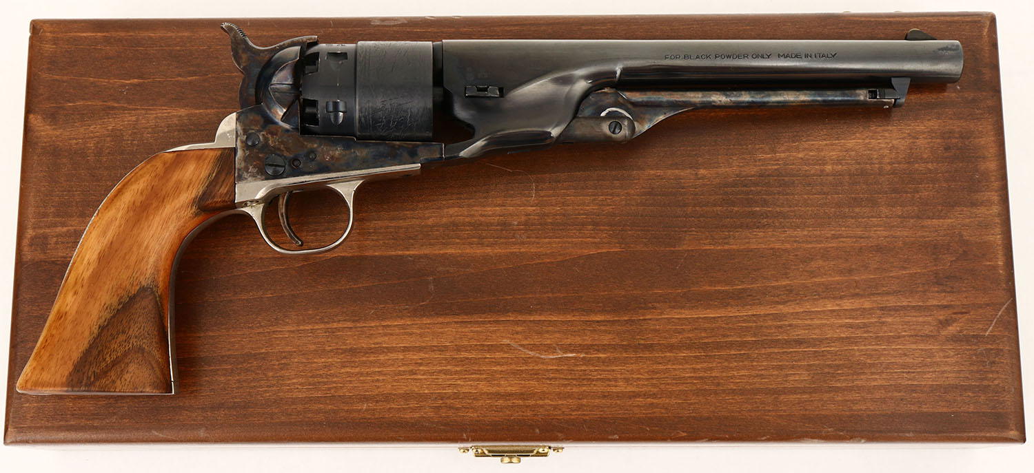 Lyman, Model 1860 Army, CAL: 44, MFG: Modern, SN: 22517, Black Powder Percussion Revolver, 7 3/4'' barrel. The wood grips are excellent. The engraved cylinder & barrel retain 98% original blue finish. The trigger, hammer, loading lever & frame all have vivid case-colors. The trigger guard & back strap retain 98% of nickel finish. Bore is excellent. The barrel carries a brass bladed front sight. Comes in a walnut wood box with a red lining, has tool, caps & old lead balls. A high condition, modern black powder revolver. Black Powder, No FFL Req - Value: 250 to 500
