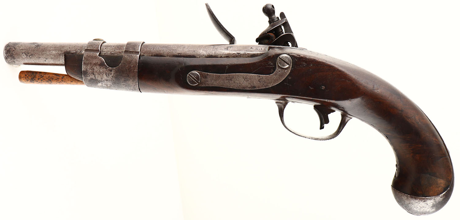 Simeon North U. S. Midln Con Flintlock pistol. 54 cal., MFG: 1813-1818, SN: NONE Single Action, U.S. marked & with Eagle stamp. Built between 1813-18, 8 1/2'' Heavy barrel, with a 9/16'' muzzle. The wood is very good, with lovely grain & a feathered pattern. The stock has a large crack repair at the top of receiver & spliced inlay repair at the left side of the buttend. The metal has worn gun metal gray, with a thin brown patina & rust pitting in areas. Brass component has a smooth aged patina. Locks are functional, with strong spring tension. Bore is fair, with roughness. Has a 8 3/4'' ramrod. In 1813, Simeon North of Middletown Connecticut was awarded a contract with the United States Government to make 20,000 pistols over five years. This was the first government contract ever signed for weapons with interchangeable parts. Overall, a very good condition & wonderful example of a rare antique US marked military flintlock pistol. No FFL Req. - Value: 1000 to 3000