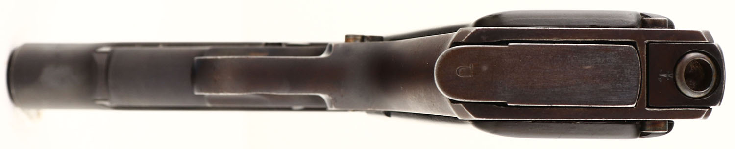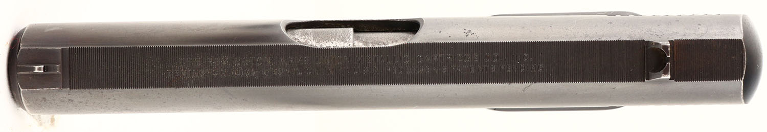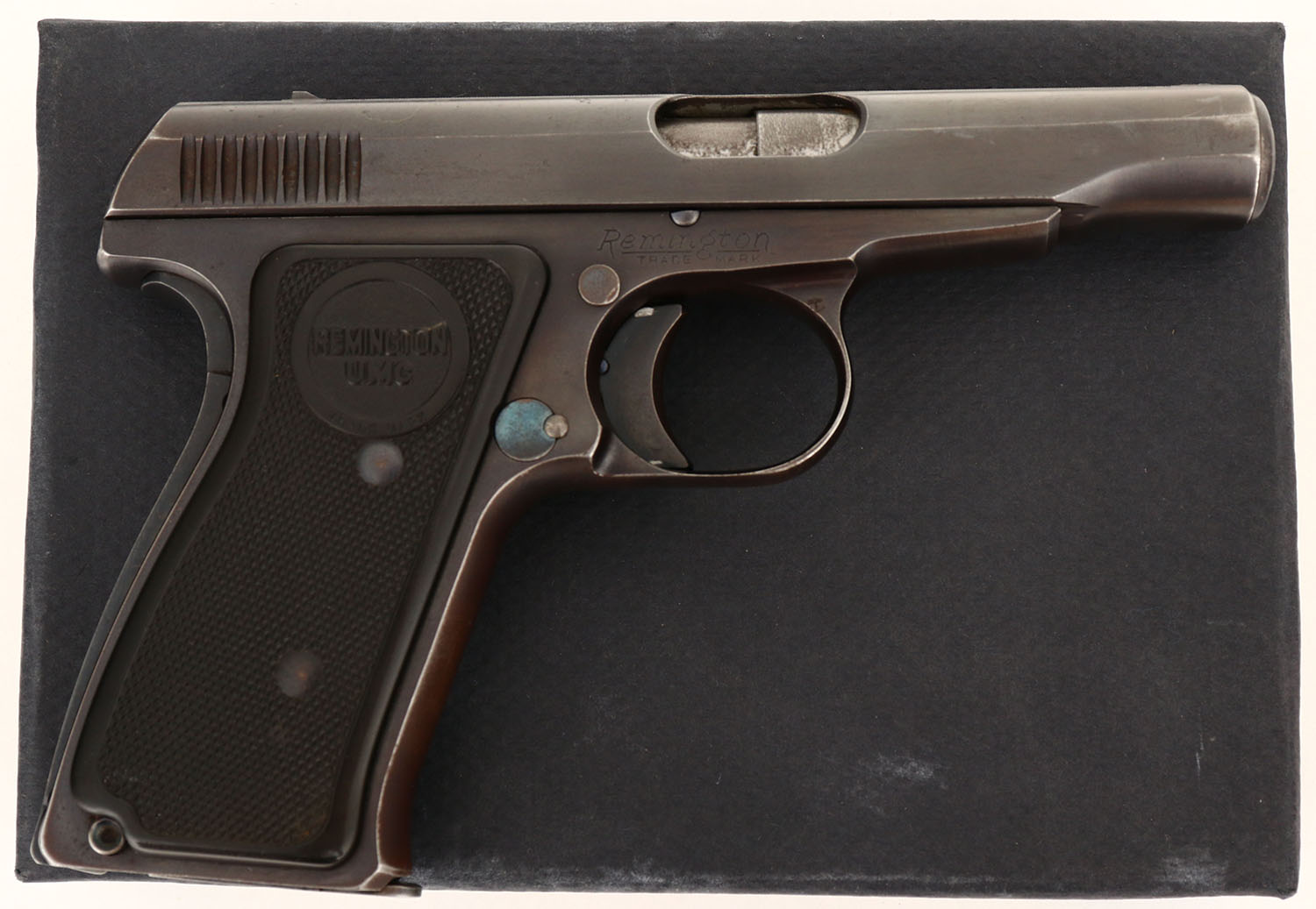 BOXED, Remington, Model 51, CAL: 380, MFG: 1918-26, SN: PA21168, Semi-Auto Pistol, 3 3/8'' barrel. The REM-UMC marked, checkered hard rubber grips are very good, with handling marks. The metal blue finish rates 80%, beginning to tone to brown patina, more so around the carry points, with light surface scrapes & small areas worn to metal gray. Bore is very good, with visible wear & defined rifling. Factory sights. Dual safety mechanisms. Comes in a correct period Remington box, with original paperwork. Box has been repaired on all corners, most seams glued or braced & the top has been recovered. FFL or C&R Req. - Value: 500 to 1000