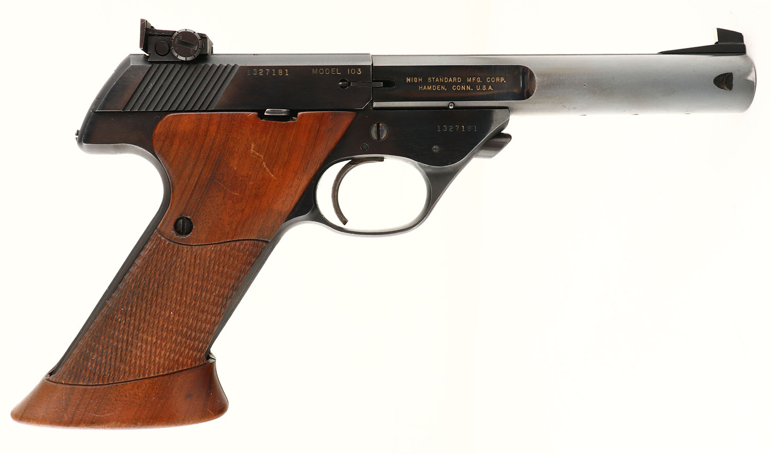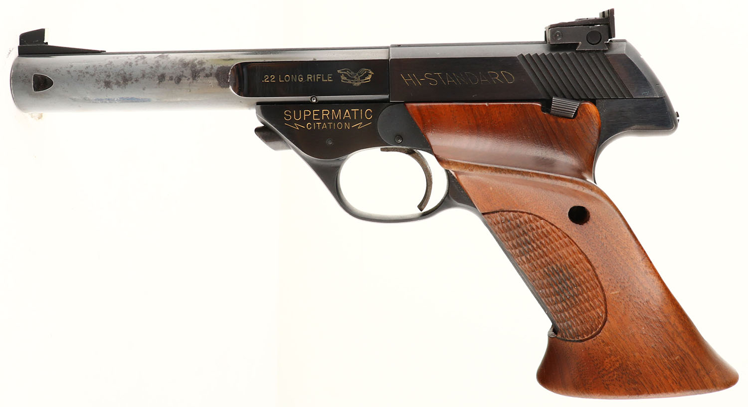 High-Standard, Model S-103 ''Supermatic Citation'', CAL: 22LR, MFG: 1963, SN: 1327181, Semi-Auto Pistol, 5 1/2 '' barrel. Approximately 24,000 model 103 Supermatics produced from 1960 to 63. The checkered walnut target grips, with right hand thumb rest, are excellent, with some light scuffs. The metal blue finish rates 85% overall, with some light wear at the muzzle of the barrel. There is 3'' section of rust pitting on the left side of barrel from improper storage, which appears to have bluing touch-up. Barrel is factory tapped/threaded for barrel weights, none attached. The frame contains serrations on the front & back sections of grip for added retention. Bore is excellent & bright. Factory adjustable rear sight & fixed blade front sight, both have white paint accenting. Hi-Standard marked magazine. FFL or C&R Req. - Value: 400 to 800