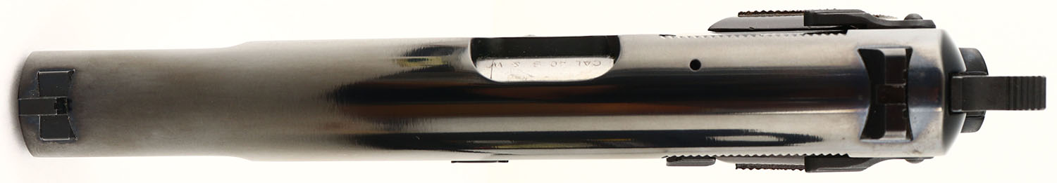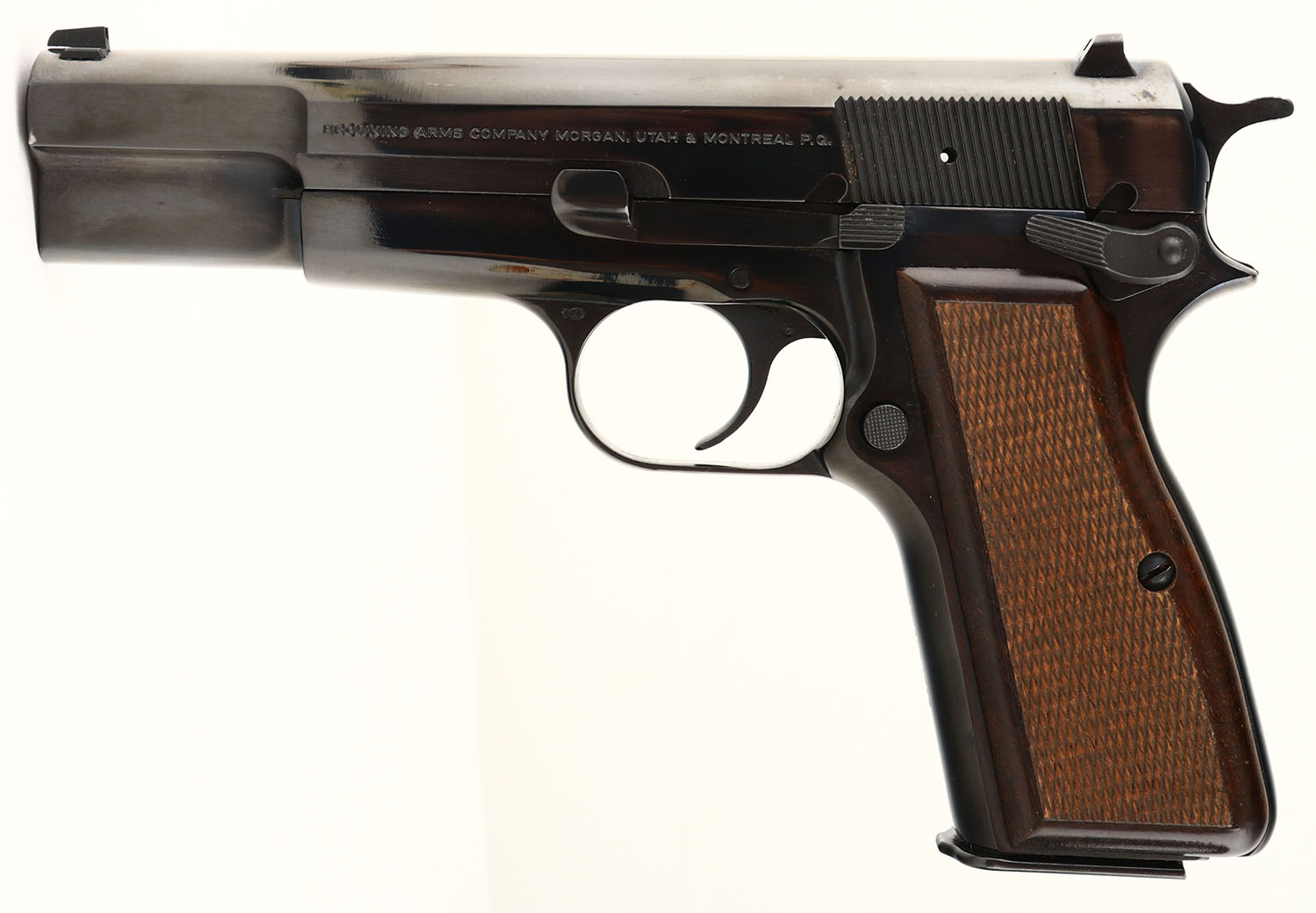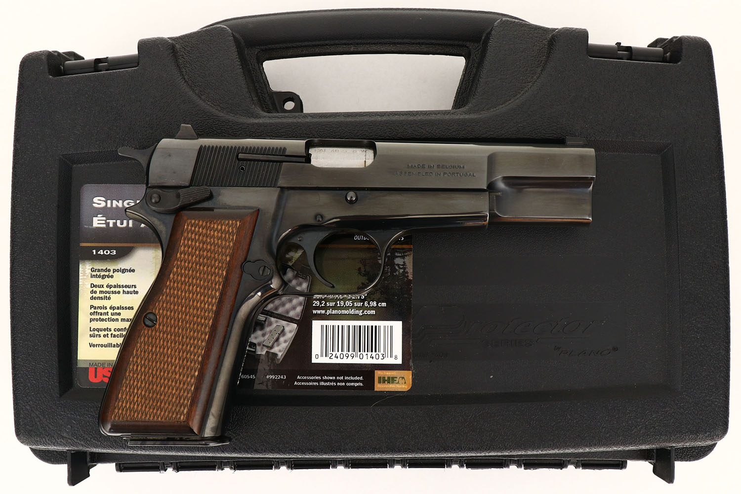 Browning (Belgium) Model ''Hi-Power'', CAL: 40 S&W, MFG: 2003, SN: 513MX50813, Semi Auto pistol, 4 1/2'' barrel. The wood checkered grips are excellent. The polish blued finish is 98%. The bore is excellent & bright. The slide carries a fixed rear & front sights. Has (2) 10 round magazines. The pistol comes in a aftermarket plastic case. FFL Req. - Value: 900 to 1300