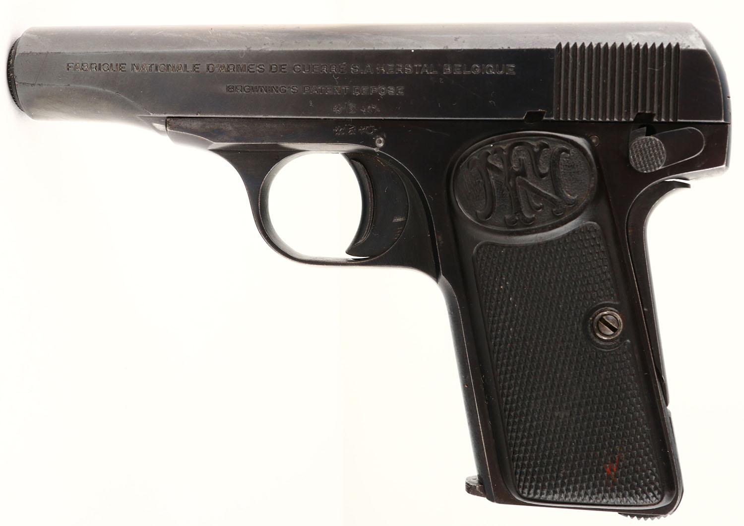 A blowback semi-automatic pistol designed by John Browning. Approximately 705,000 produced, mainly for the European market, WWI & WWII. The pistol incorporates the standard Browning striker-firing mechanism, a grip safety along with a magazine safety & an external safety lever (known as the ''triple safety'') in a compact package. The original checked grips are excellent with ''FN'' logo on top. The metal blue finish is 95%. There is a ground gouge in the frame above the trigger on the right side. Bore is excellent & bright. Notch & fixed blade sights. Original FN marked 7 round mag. FFL or C&R Req. - Value: 600 to 1000