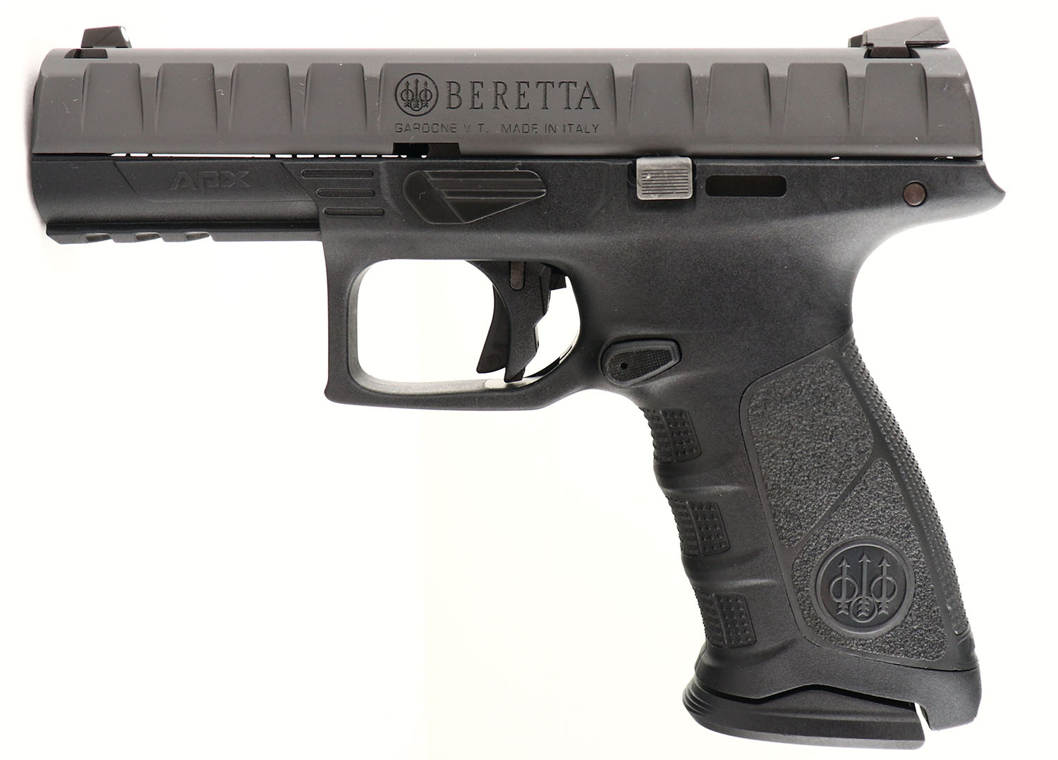 Beretta, Model APX, CAL: 9mm, MFG: Modern, SN: A114594X, Semi Auto Pistol, 4 1/8'' barrel. The Beretta marked Techno polymer frame is excellent. The matte black finish on the slide is excellent, rating 99%. Bore is near mint. Factory sights. Comes in the original hard case, with the owners manual, cleaning brush, lock, extra mag, extra grips & speed loader. FFL Req. - Value: 400 to 600