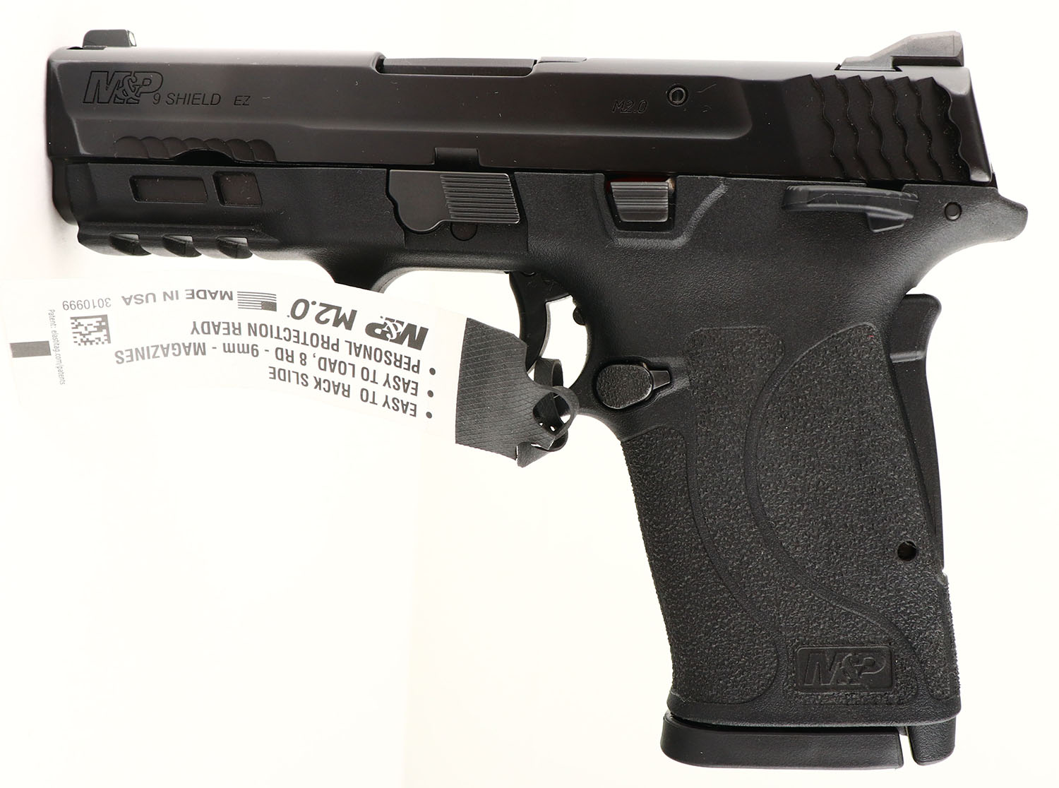 BOXED, Smith & Wesson, Model M&P 9 Shield EZ M2.0, CAL: 9mm, MFG: Modern, SN: NKK5810, Semi Auto Pistol, 3 1/2'' barrel. The S&W marked textured polymer frame is excellent, with minor handling marks. The Armornite finish on the slide is excellent, with very minor surface scrapes. Bore is excellent, near mint. Bright white dot front & 2 dot rear sight. NIB. New old stock. Comes in original box, with owners manual, paper articles, lock & tool. This pistol has a very thin design & is lightweight, making it comfortable to carry all day & a perfect conceal carry pistol. FFL Req. - Value: 350 to 700