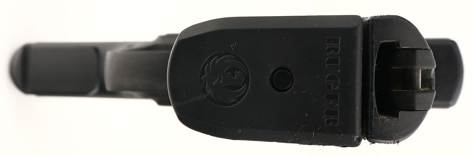 Ruger, Model E9, CAL: 9mm, MFG: 2017, SN: 338-18620, Semi Auto Pistol, 4'' barrel. The Ruger logo textured polymer grip frame is excellent, with minor handling marks. The metal blue finish on the slide rates 95% overall, with blemishes, spotting & speckling, toning to a brown patina. Bore is very good & bright, displaying normal wear from use. The slide holds a dual white dot rear sight & single white dot blade front sight. A good utilitarian 9mm. FFL Req. - Value: 200 to 400