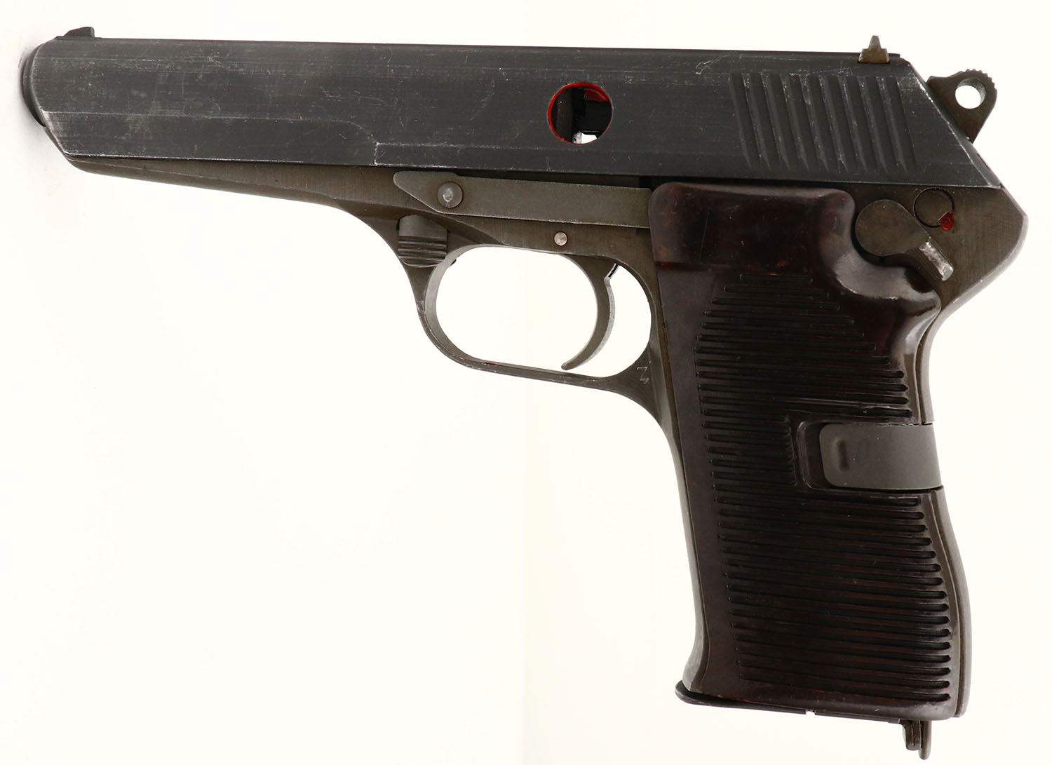 CZ, CUT-A-WAY SALESMAN SAMPLE or DEMO PISTOL, Model CZ52, 7.62 TOK Cal, MFG: 1953-54, SN: CUT301, Semi Auto Pistol, 3 3/4'' barrel, The molded plastic grips are very good, The metal matte finish is 60%, Bore is excellent, Unusual, factory cut-a-way. Comes with a leather holster with extra mag. No FFL Req. - Value: 200 to 500