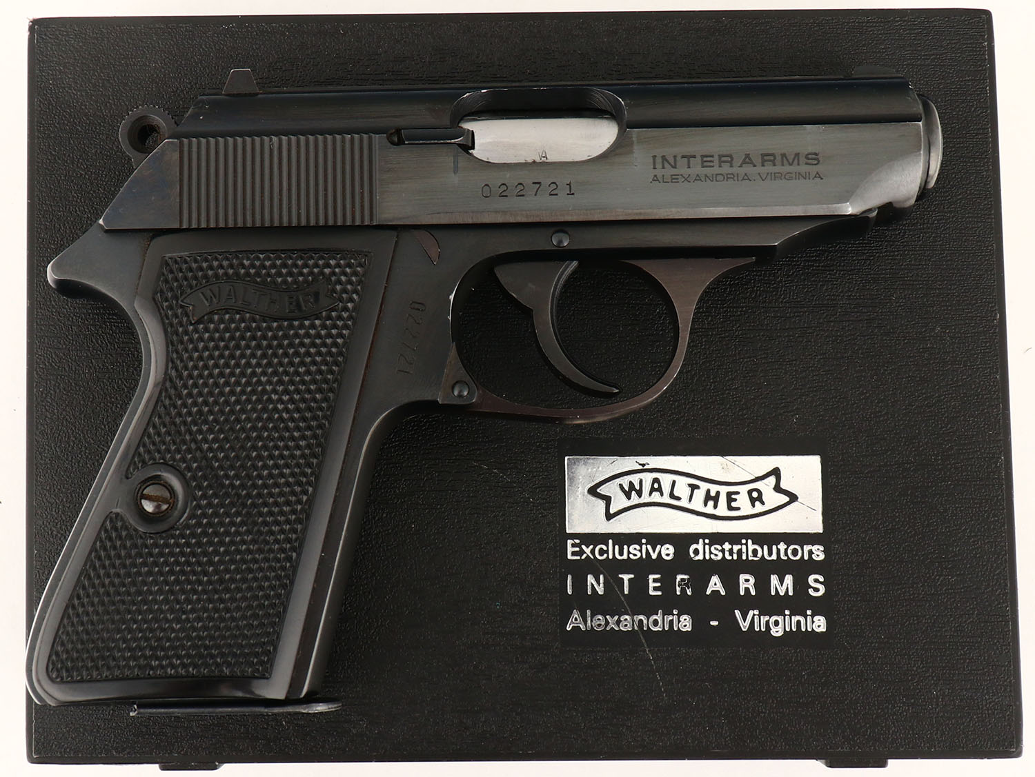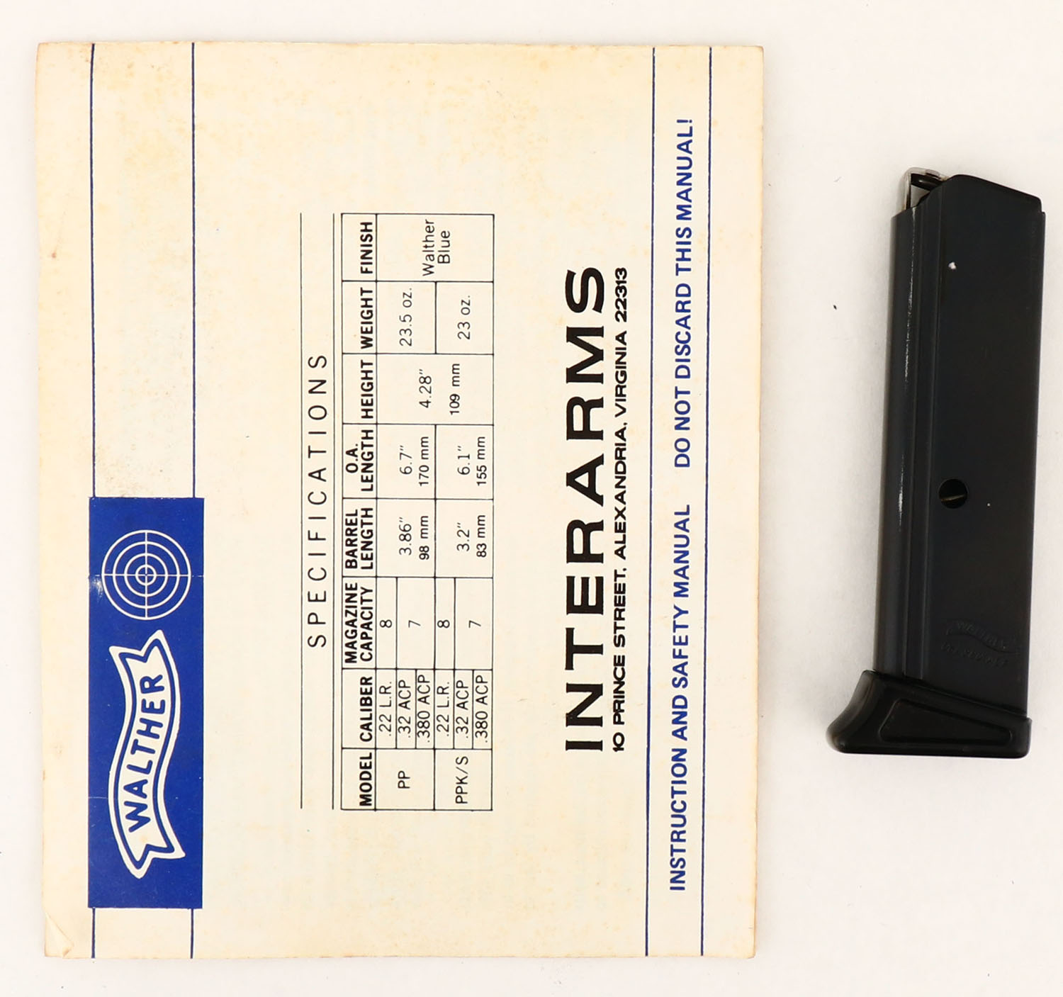 BOXED, Walther, Model PPK/S, CAL: .380, MFG: 1980's-90's, SN: 022721, Semi Auto Pistol, 3 1/4'' barrel. The factory Walther checkered plastic grips are excellent. The metal blue finish rates 98% overall, with minor scuffs. Bore is very good, with light pitting's at the muzzle. The slide holds factory sights. Comes in original box, with safety manual & extra mag. FFL Req. - Value: 400 to 700