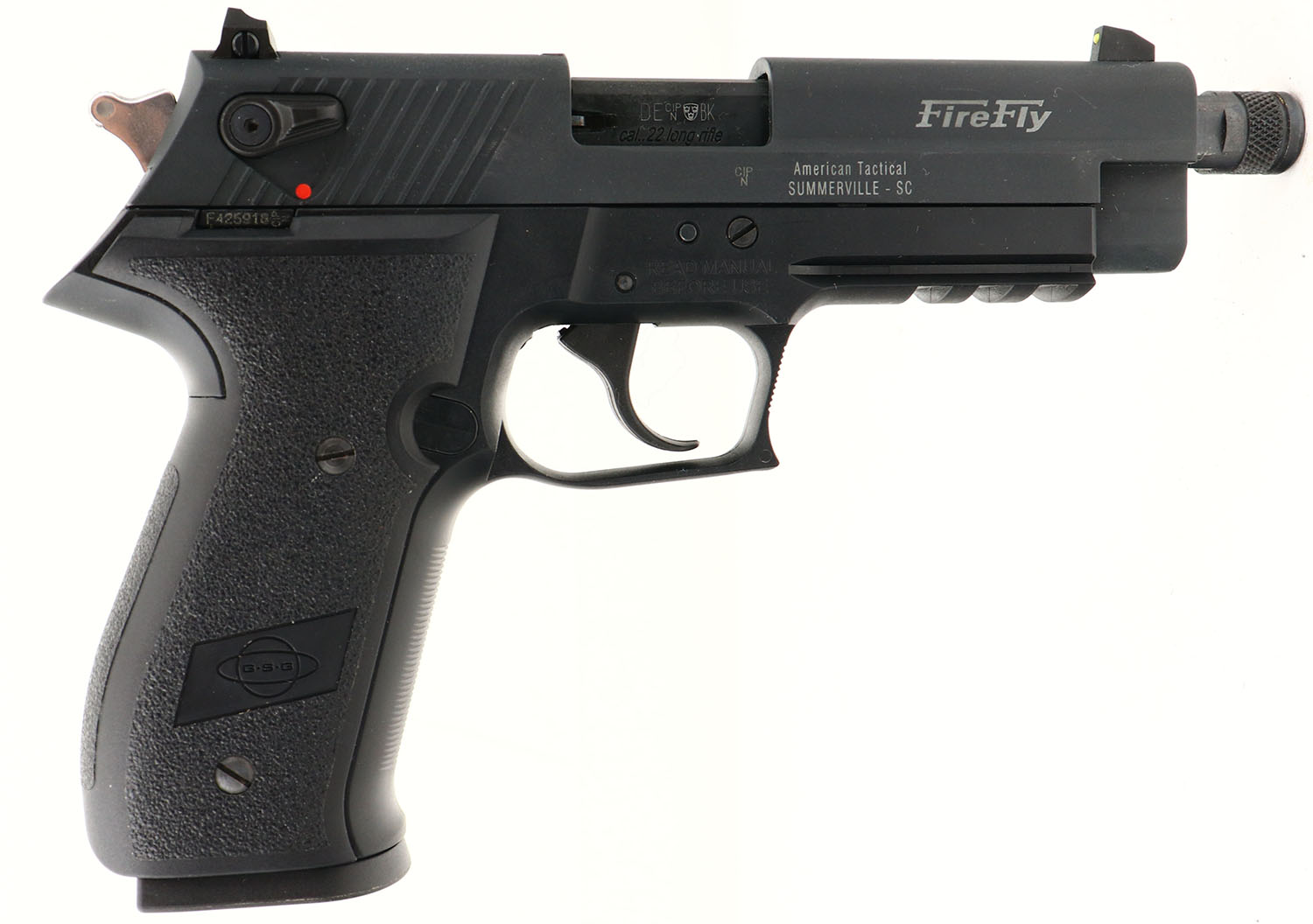 GSG, Firefly, CAL: 22LR, MFG: Modern, SN: F425918, Semi Auto Pistol, 4 3/4'' barrel. The textured black polymer grip frame is excellent. The matte black finish on the zinc alloy slide is excellent, rating 99%+. Bore is excellent & bright. The slide holds an adjustable dual yellow dot rear sight & single yellow dot front sight. Ambidextrous thumb safety. Threaded barrel for possible silencer attachment. A seemingly new semi auto .22 pistol. FFL Req. - Value: 150 to 300