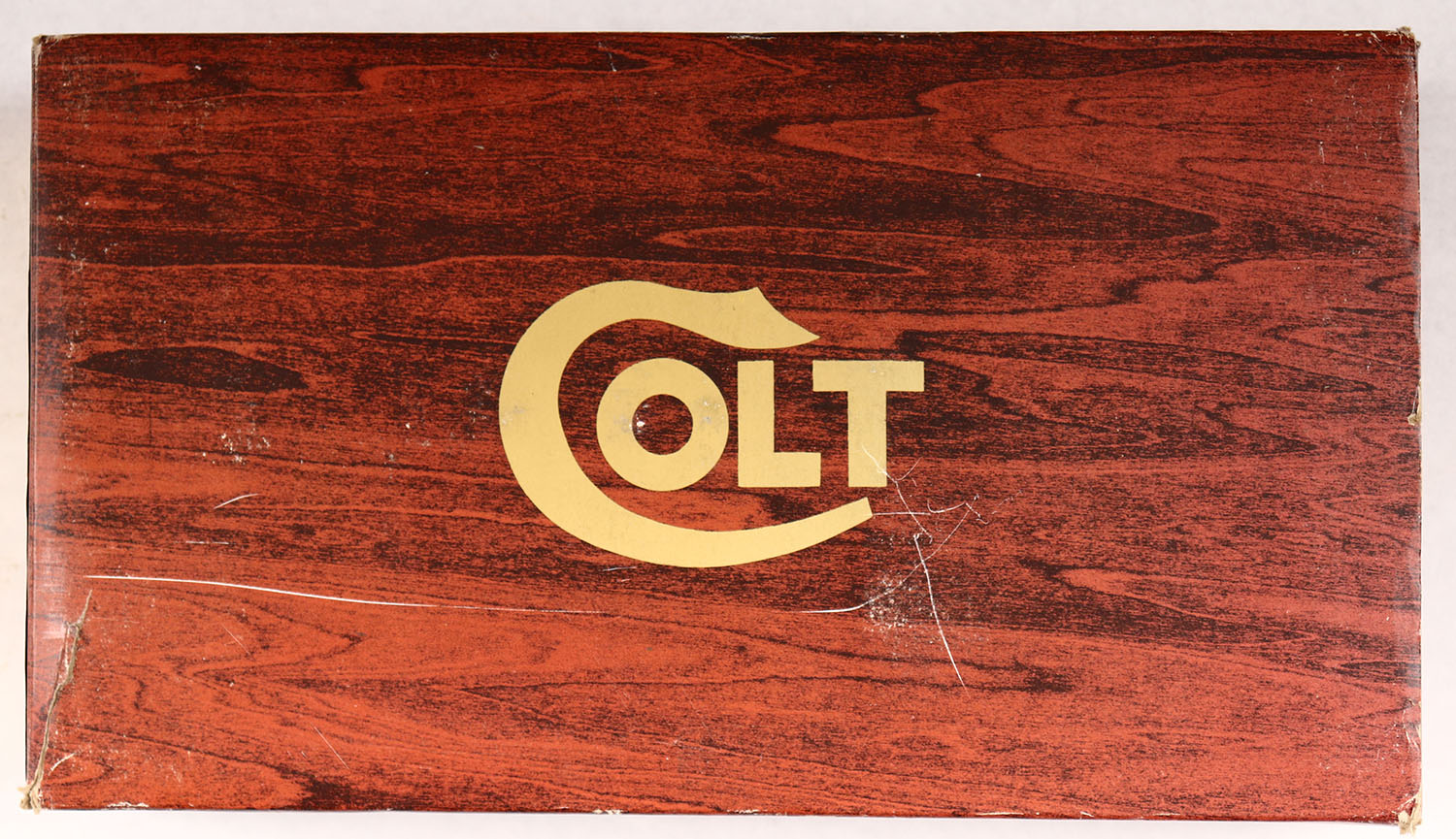 Original Colt box for a Government Model Mark IV/ Series '70, Specs are Blued, .45 cal., 5''. This is a wood grain style box, with the styro inner box, original letter, booklet, pamphlet & the bag. - Value: 10 to 100