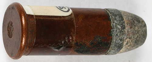 44 Henry Flat-Long Case (CL=.91''), HS''US'' raised in a small circle (off center), Copper case, FN Lead w/ wide belted ball. Grade: Very Good - Value: 10 to 40