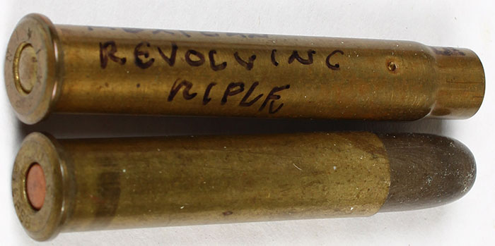Lot of 2 H/S= '' P N'' 7.65x50R Pieper revolving rifle, mexico, 3-stab crimps, oval, BR. PRL., F.P. BR. RN. H/S= ''U.M.C. Pieper'', oval COP. PRL. F.P. BR. FN. Grade: Very Good + - Value: 20 to 40