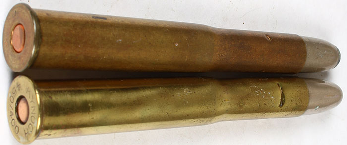 Lot of 2 H/S= ''KYNOCH 450/400 NITRO'' 3 1/4'' C.L. FLT. COP. PRL., S.P. TIN R.N. H/S= ''KYNOCH 450/400'' 3 1/4'' C.L. oval COP. PRL., F.P. C.N. R.N. Grade: Very Good + - Value: 20 to 40