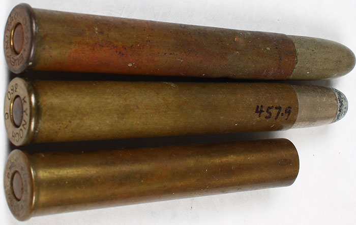Lot of 3 H/S= ''KYNOCH 360 C'' 2 1/4'' C.L. FLT. COP. PRL., S.P. TIN R.N. H/S= ''ELEY London 360'' 2 1/4'' C.L. gallery load, oval COP. PRL. Receeded LD ball H/S= ''ELEY NITRO 360'' 2 1/4'' C.L. oval COP. PRL. F.P. C.N. R.N. Grade: Very Good + - Value: 20 to 40