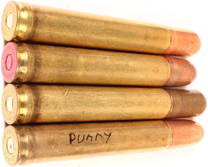 Lot of (4) .458 Win. Mag., H/S= A - Square, 4 variations (1.) Armorer's function dummy (1.) proof load, w/red stained HD. (1.) F.P. BR. RN. Belted. And S.P. G.M. R.N., all have FLT. NIC. PRL. Grade: Excellent - Value: 20 to 40