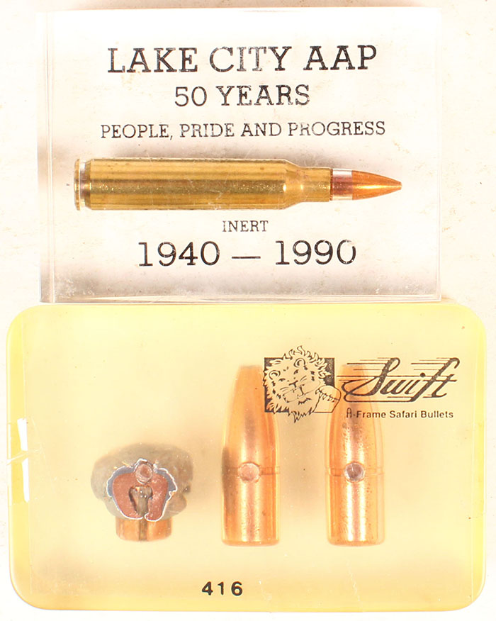 Lot of 2 (1) Swift A-frame safari bullets 1-shot mushroom sample, 1- sectioned sample & 1- full BL'T. partially drilled, in a 2'' x 3 1/4'' lucite display block. (1) H/S= ''LC'' inert .223 displayed in a 2'' x 2 3/4'' clear lucite block celebrating 50 years, ''Lake City AAP 50 years, people, pride and progress, 1940-1990. Grade: Excellent - Value: 20 to 50