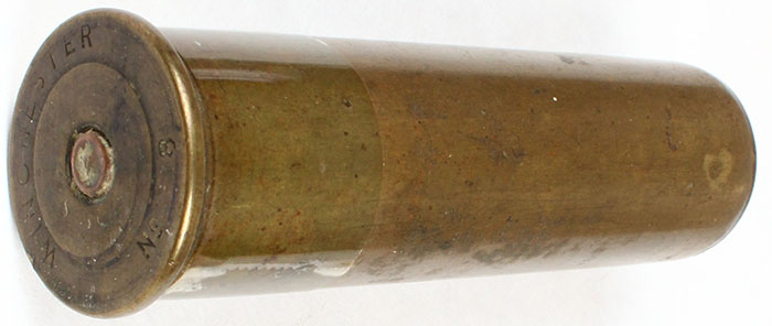 H/S: Winchester No 8, 3 3/16'' OAL. brass shotshell. Grade: Very Good + - Value: 10 to 100