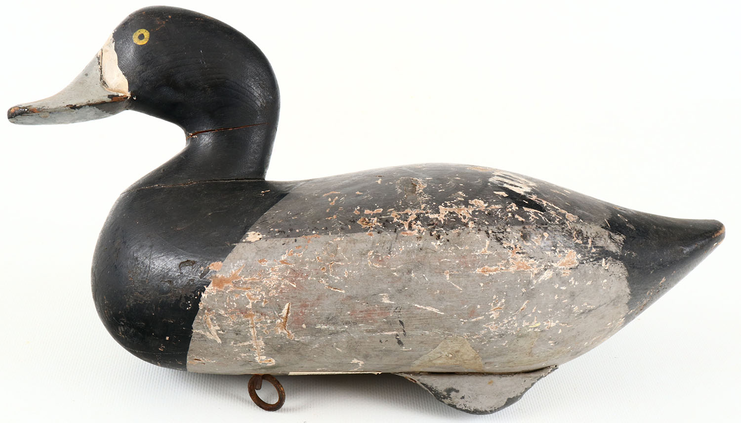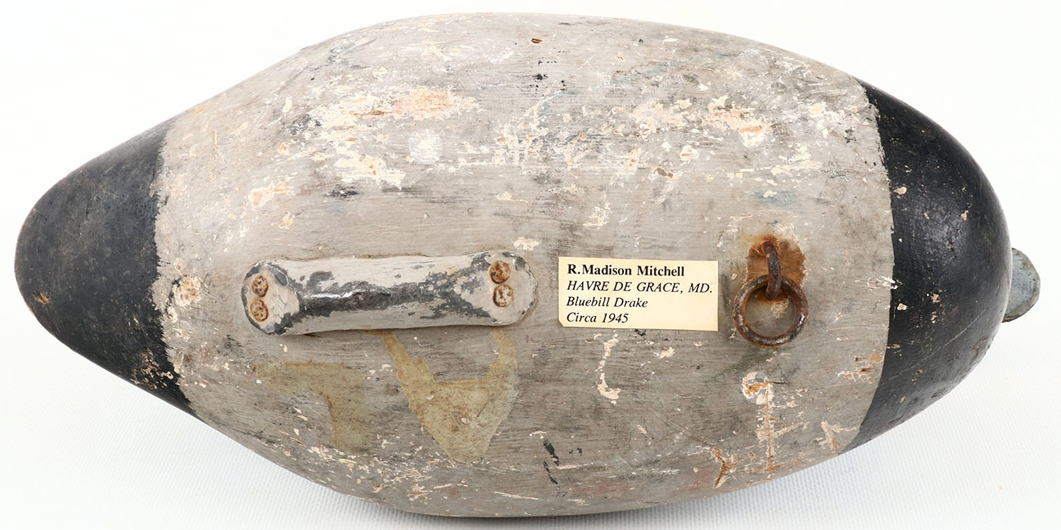 Bluebill Drake by R. Madison Mitchell, Havre De Grace, MD. Circa 1945, painted eyes, solid wood, original paint with typical wear, has hairline crack in neck, lead weight on bottom. Grade: Very Good ++ - Value: 200 to 350