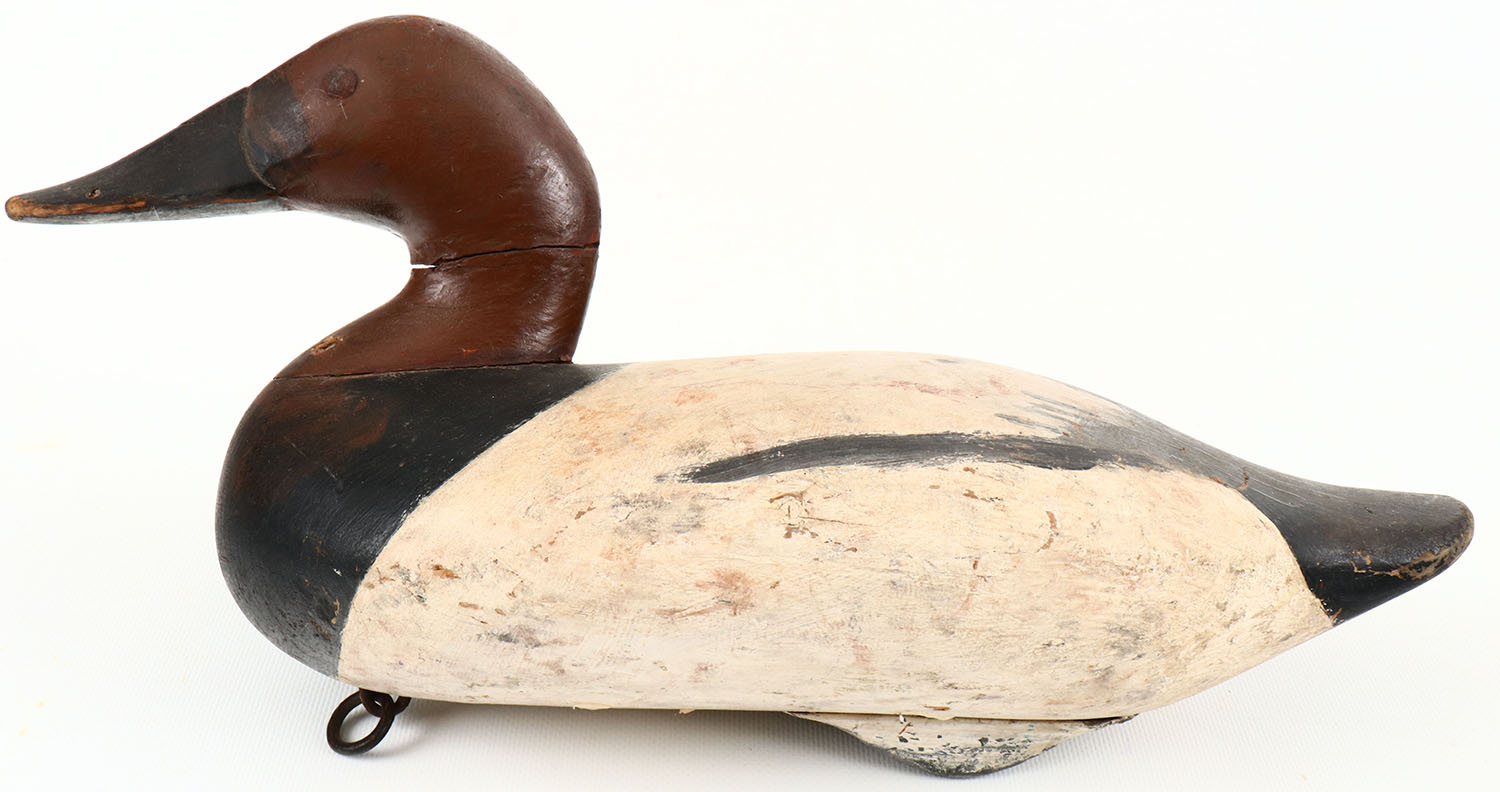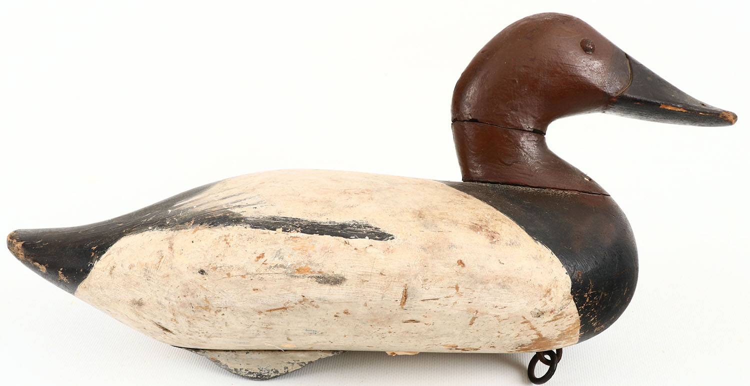 Canvasback Drake by R. Madison Mitchell, Havre De Grace, MD. Circa 1940, tack eyes solid wood, original paint with typical wear, has hairline crack in neck, lead weight on bottom. Grade: Very Good ++ - Value: 150 to 300