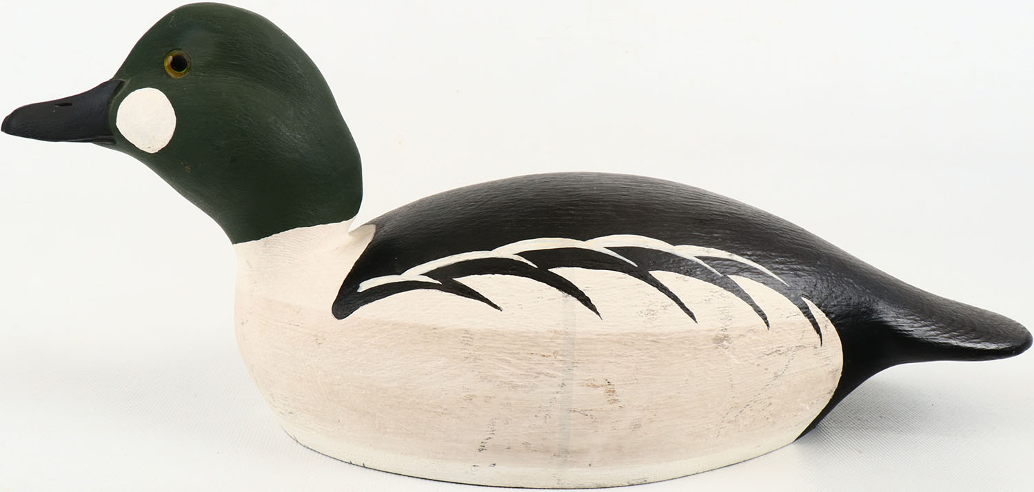Goldeneye Drake by Charlie Hilton, Trenton, Ontario, glass eyes, structurally excellent, hollow wood, has branded CH on bottom, excellent original paint. Grade: Excellent ++ - Value: 40 to 150