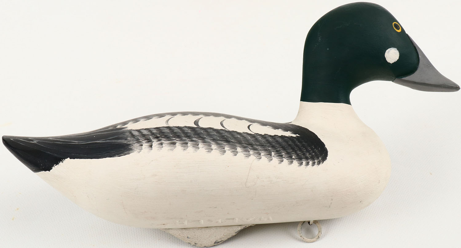 Goldeneye Drake by Dave Walker Havre de Grace, MD, solid wood, painted eyes, mint original paint, structurally excellent, bottom is signed & stamped. Grade: MINT - Value: 40 to 150