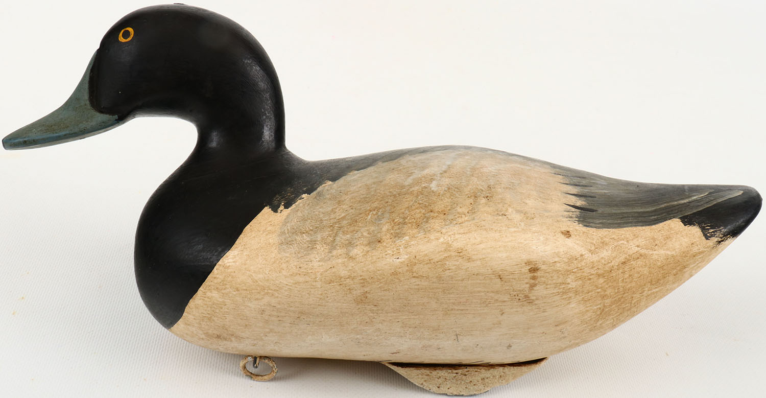 Bluebill Drake by Capt. Harry R. Jobes, Havre de Grace, MD, solid wood, painted eyes, near mint original paint, structurally excellent, bottom is signed. Grade: Excellent ++ - Value: 40 to 150