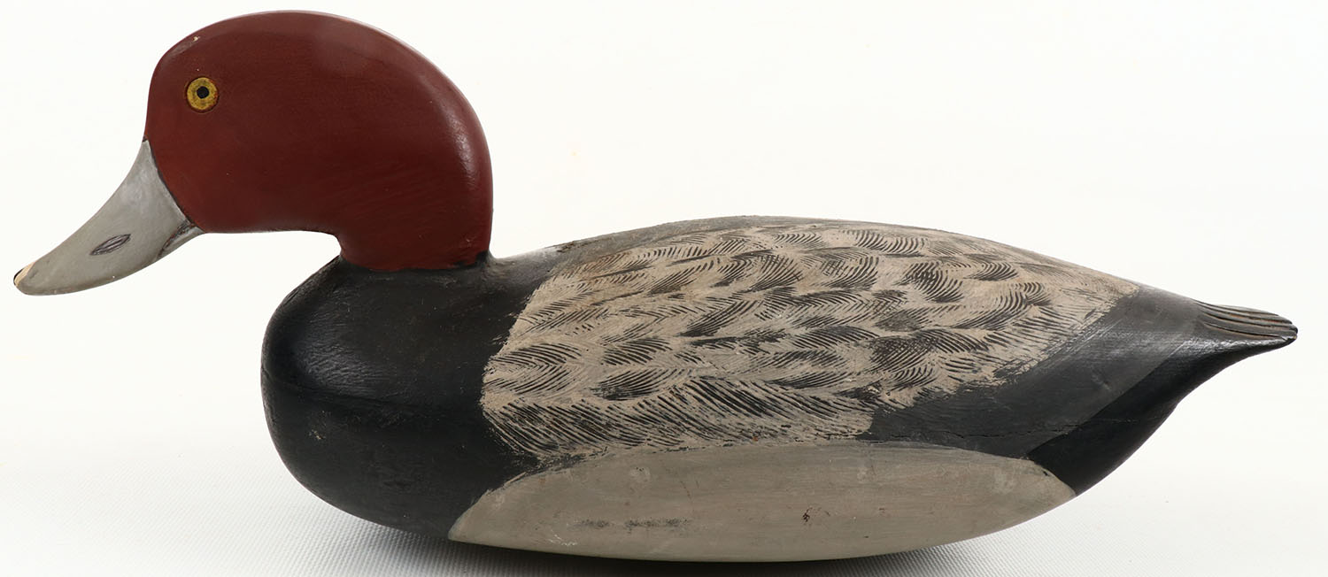 Redhead Drake by unknown maker, Del: River, Andalusia, PA. painted eyes, structurally excellent, hollow wood, excellent original paint, excellent original comb painting. Grade: Excellent ++ - Value: 40 to 150