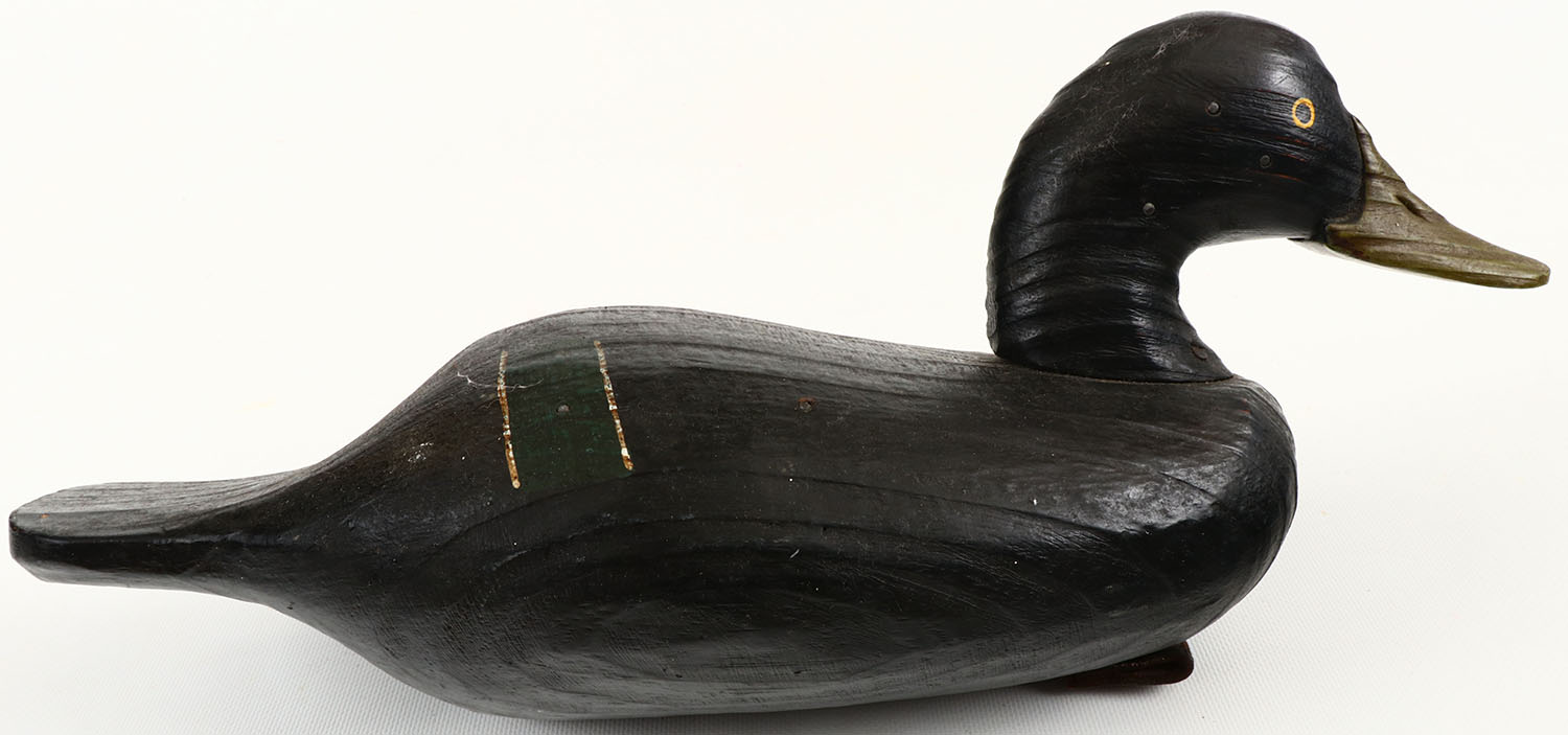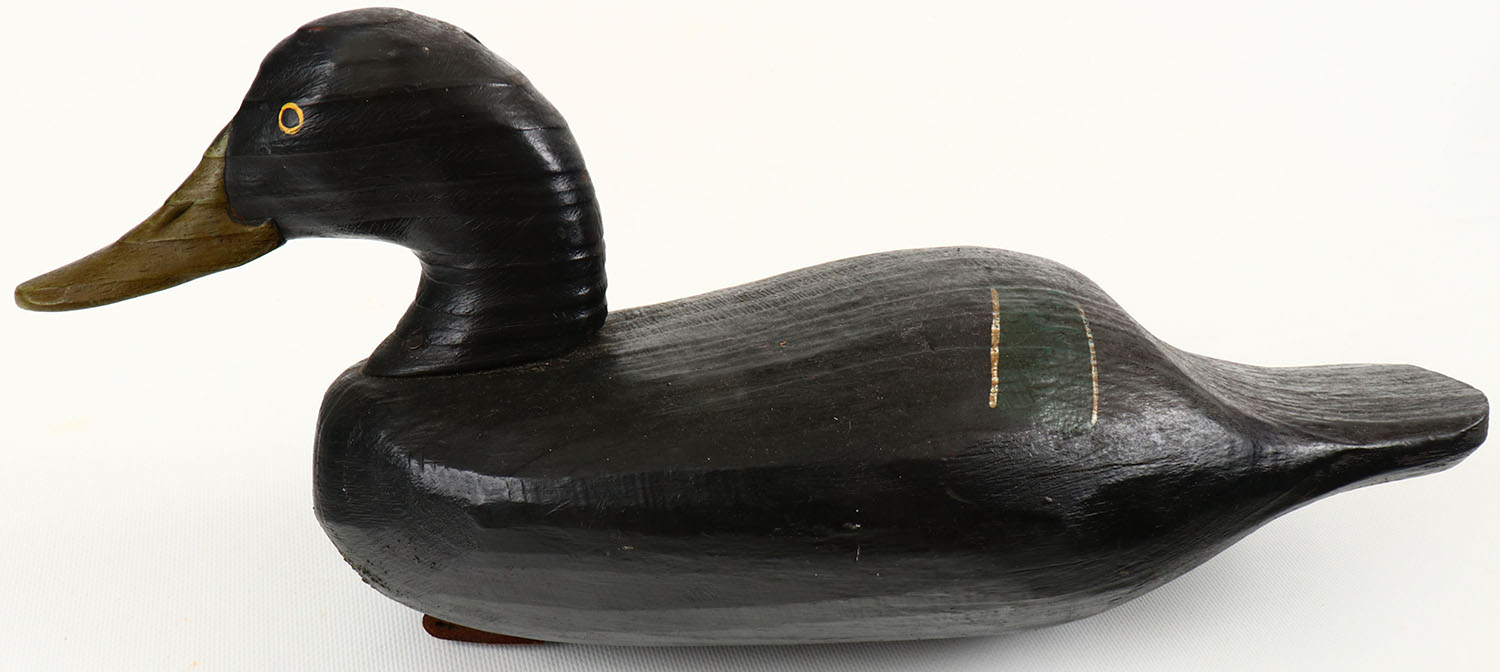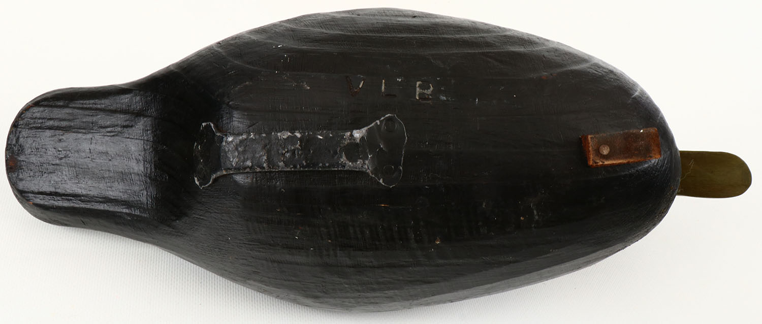 Black Duck by unknown maker, painted eyes, structurally excellent, solid wood, excellent original paint, has branded VLB on bottom. Grade: Excellent + - Value: 40 to 150